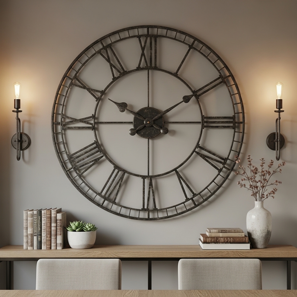 Install a large wall clock as a central feature above a sideboard or on a main wall. Choose a design that matches your interior style—modern, rustic, or minimalist. Keep surrounding decor minimal so the clock stands out without competing elements.