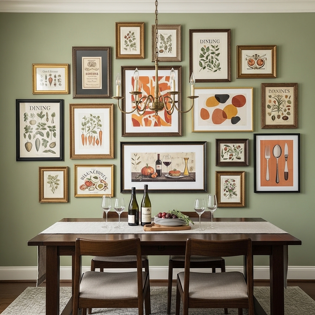Use artwork featuring food, wine, or nature-inspired themes. Keep frames consistent.