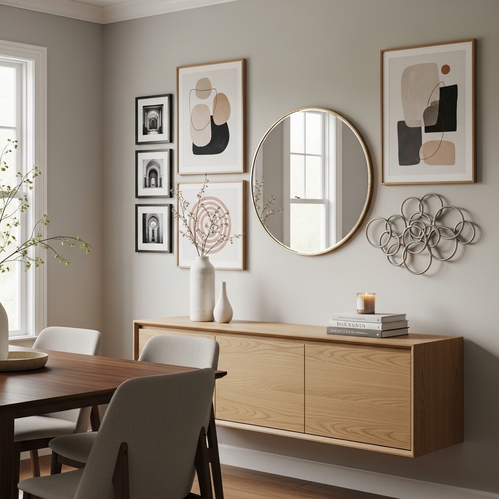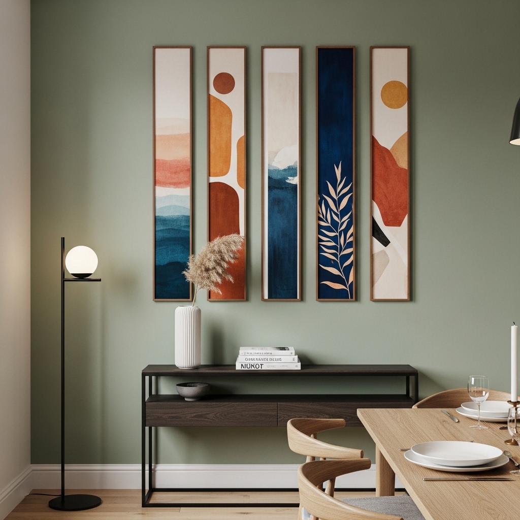 Install two or three evenly spaced panels or frames above a buffet or along the main wall. Keep sizes consistent and spacing equal to maintain symmetry. Choose neutral or coordinated tones for a calm, cohesive look.