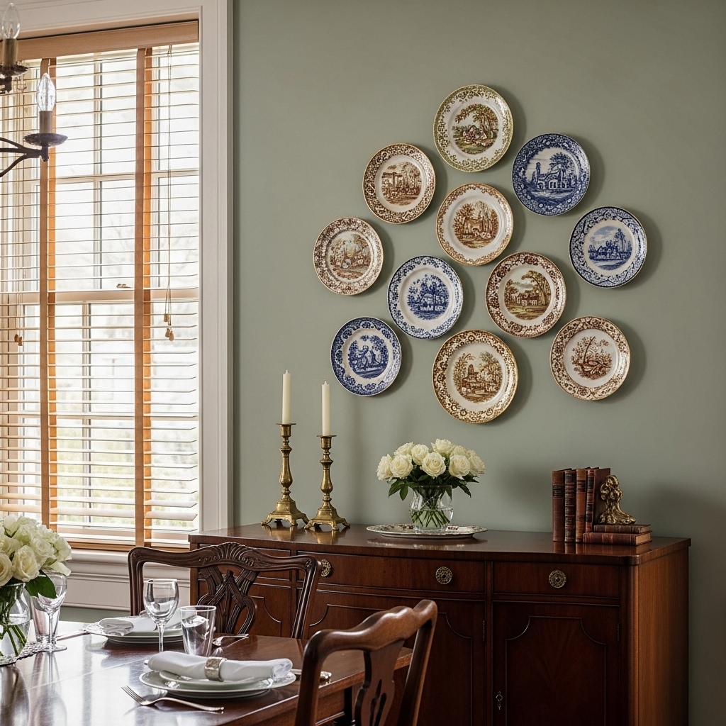 Arrange decorative plates on the wall in a structured or organic layout. Use a consistent color palette to keep the display cohesive and balanced.