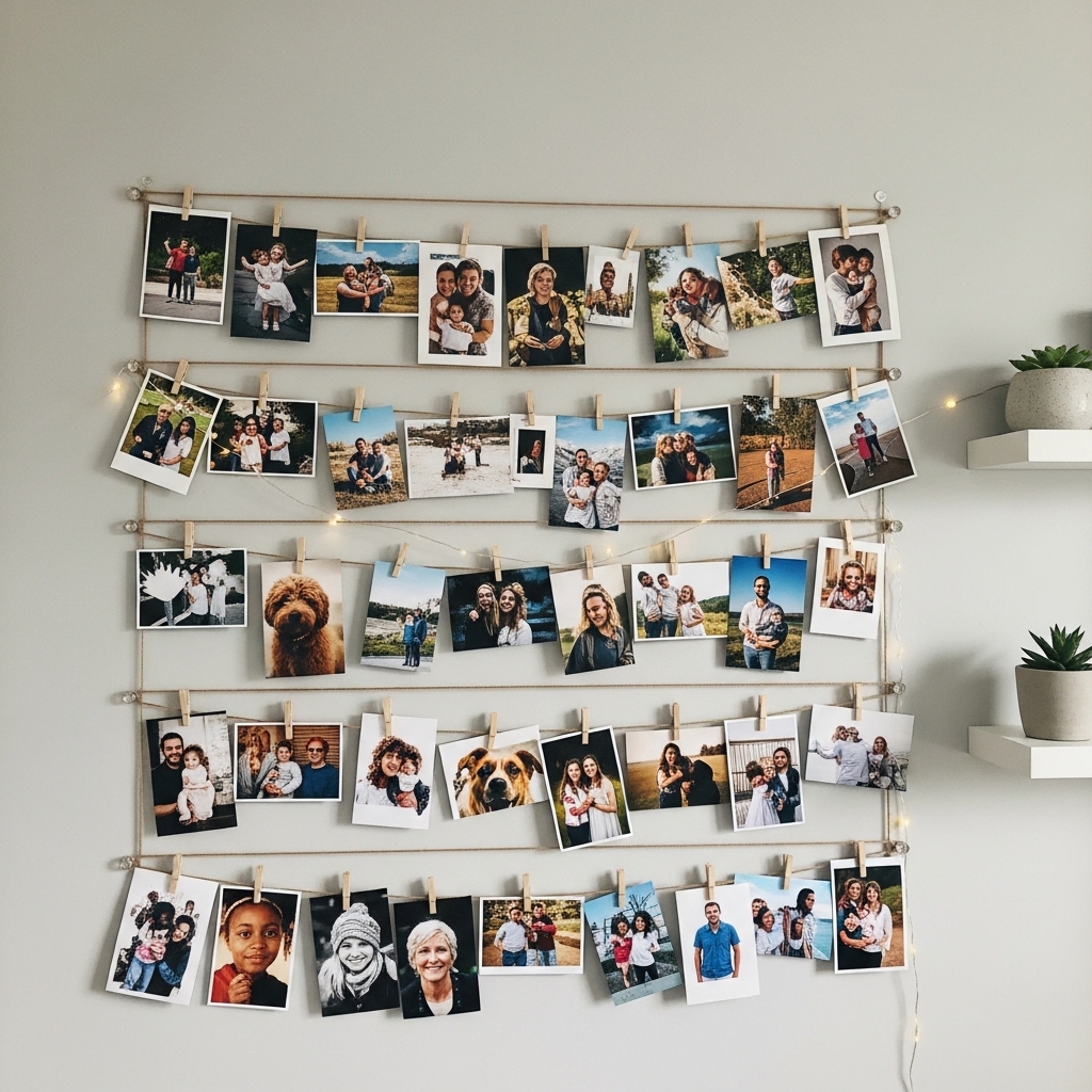 Create a grid using string, wire, or a frame and clip photos or prints onto it. Keep spacing uniform.