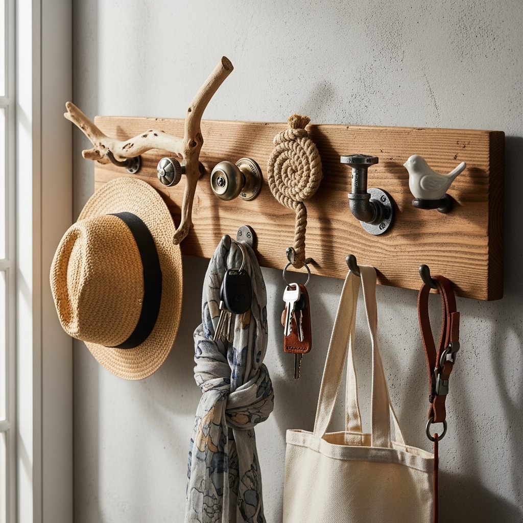 Use wood or metal pieces to create simple wall hooks for coats and bags. Space them evenly and mount securely.