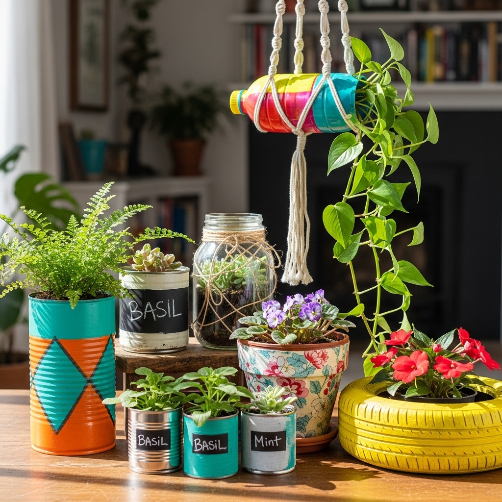 Repurpose jars, cans, or small containers as planters. Paint or wrap them in fabric or rope for a finished look.