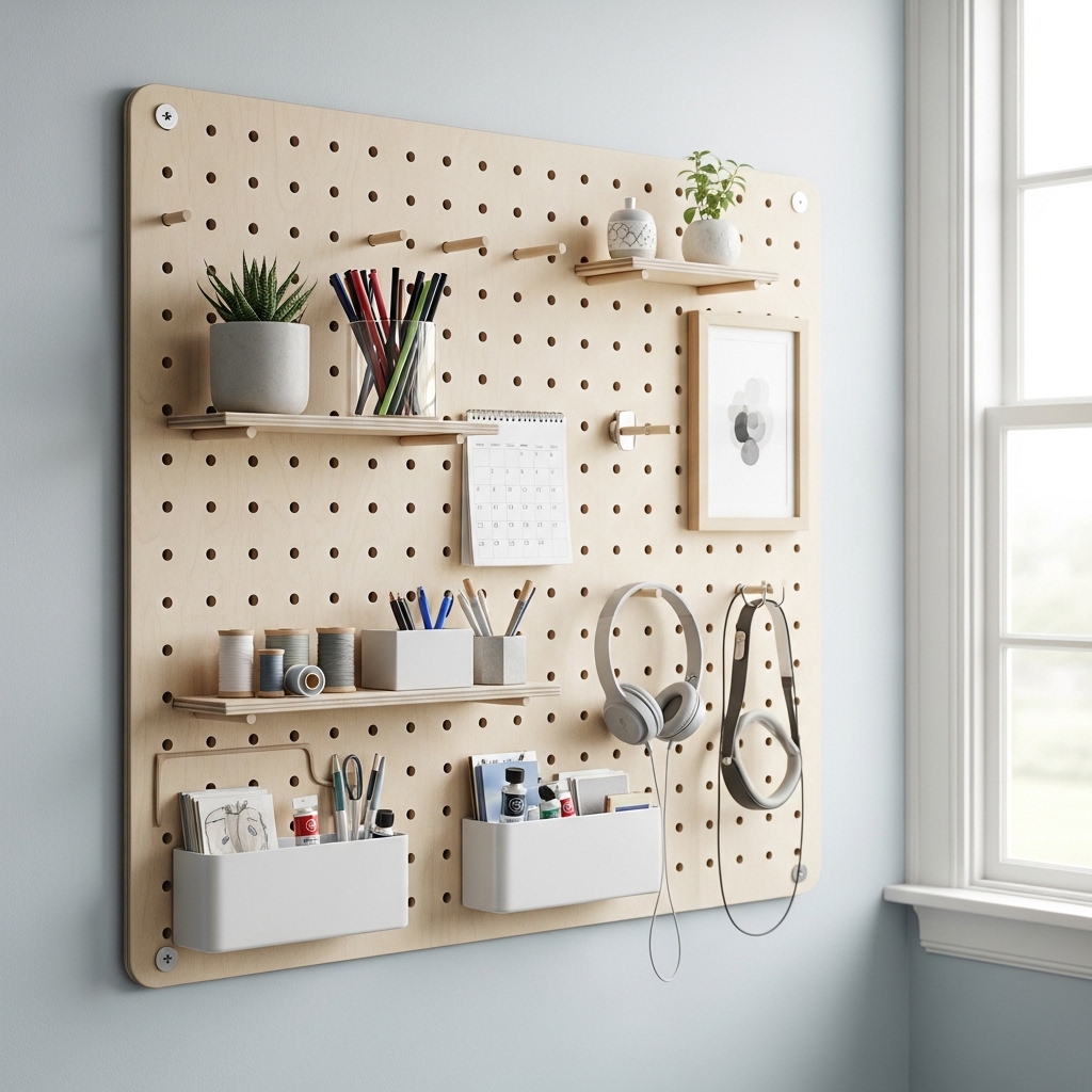 Install a pegboard on the wall and customize it with hooks, shelves, and small containers. Arrange items neatly and keep spacing consistent.