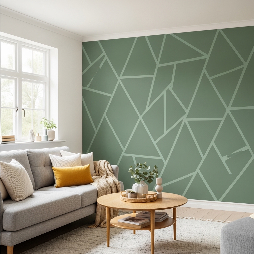 Use painter’s tape to create simple geometric shapes on one wall, then fill sections with neutral or soft contrasting colors. Keep the pattern minimal and aligned with the room’s layout.