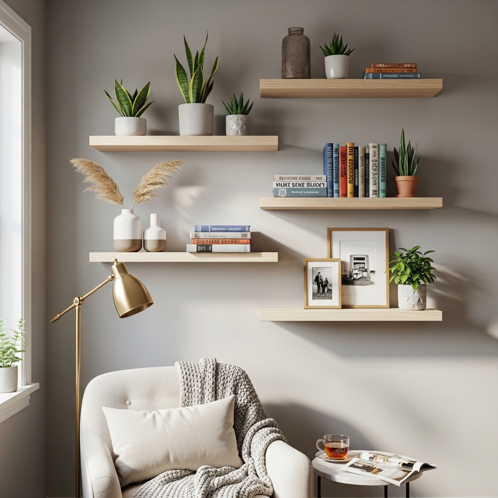 Install simple floating shelves using brackets or hidden supports. Style them with a mix of books, small decor items, and plants, keeping spacing balanced and uncluttered. Use light wood or painted finishes to match your room.