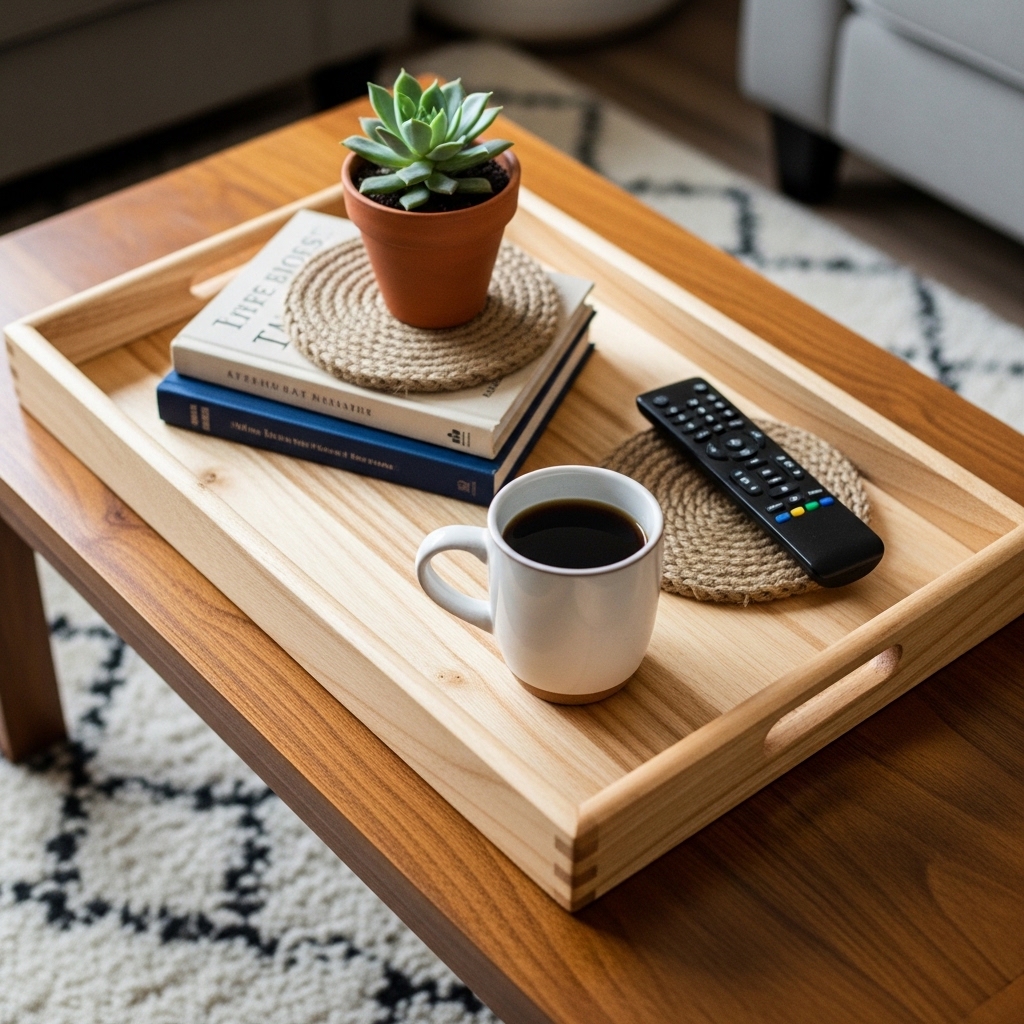 Use reclaimed wood or plywood to build a simple rectangular tray with small side handles. Sand the surface smooth and finish with a light stain or matte paint. Place it on your coffee table to hold candles, coasters, or small decor items.