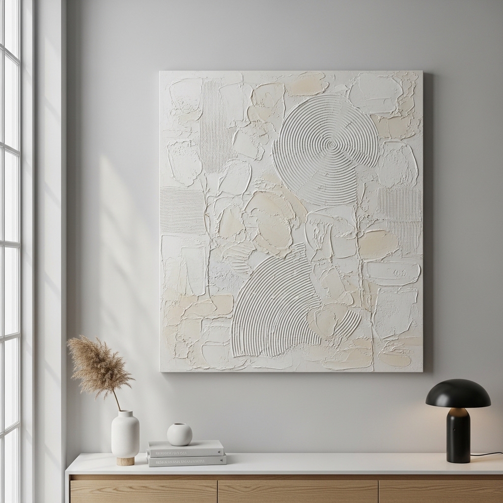 Create your own textured canvas using joint compound or plaster spread across a blank canvas with a putty knife. Keep the design abstract with soft, uneven strokes and allow it to dry fully before painting in neutral tones. Hang it as a standalone piece or pair it with minimal wall decor for a clean look.