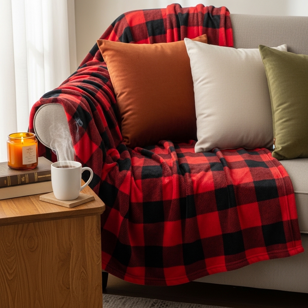 Fold a flannel throw over the arm of the sofa. The pattern should be plaid. The colors should be deep.