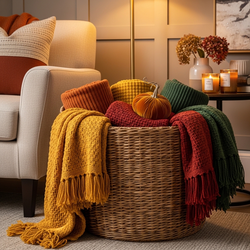 Fall decor is different from summer. Summer was light. Fall is heavy. Warm blankets. Darker colors. Textures that invite touch.