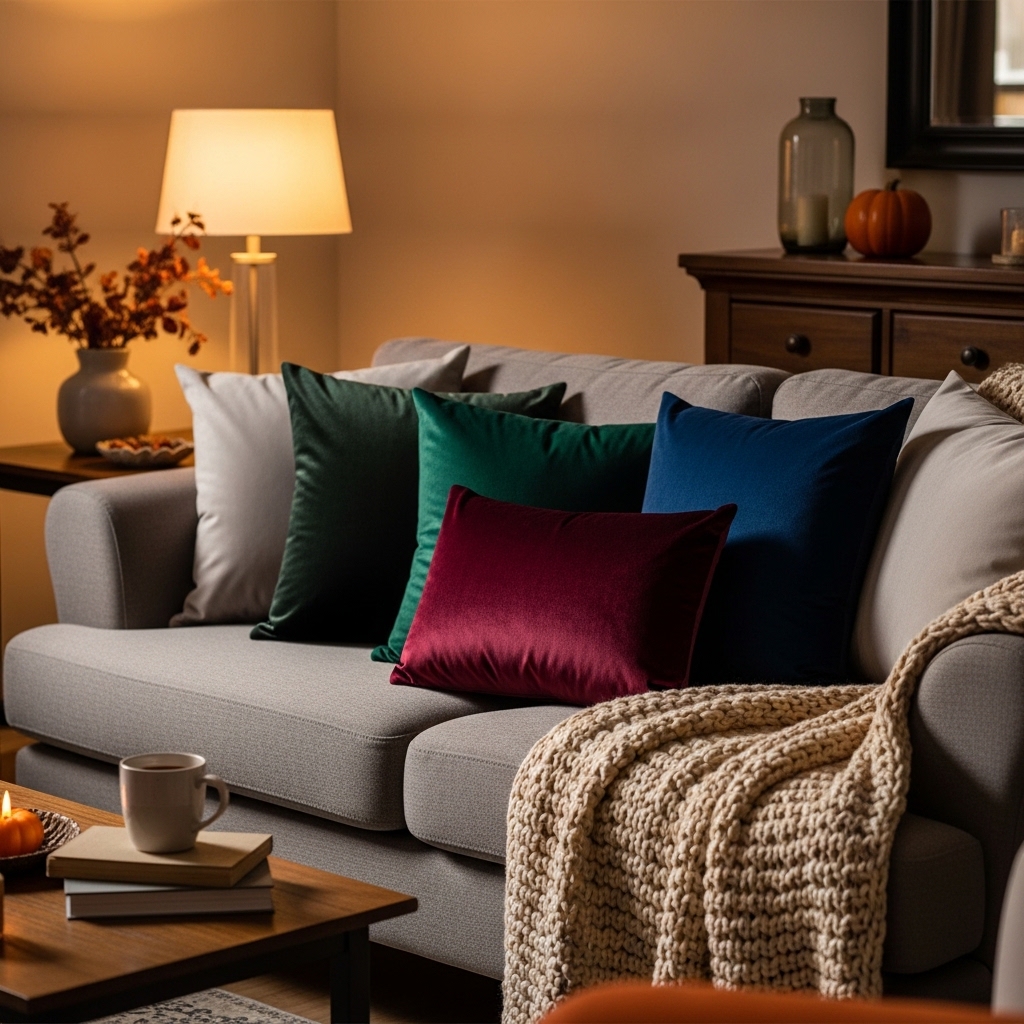 Replace light pillow covers with dark velvet. Burgundy. Navy. Forest green. The texture will be rich.