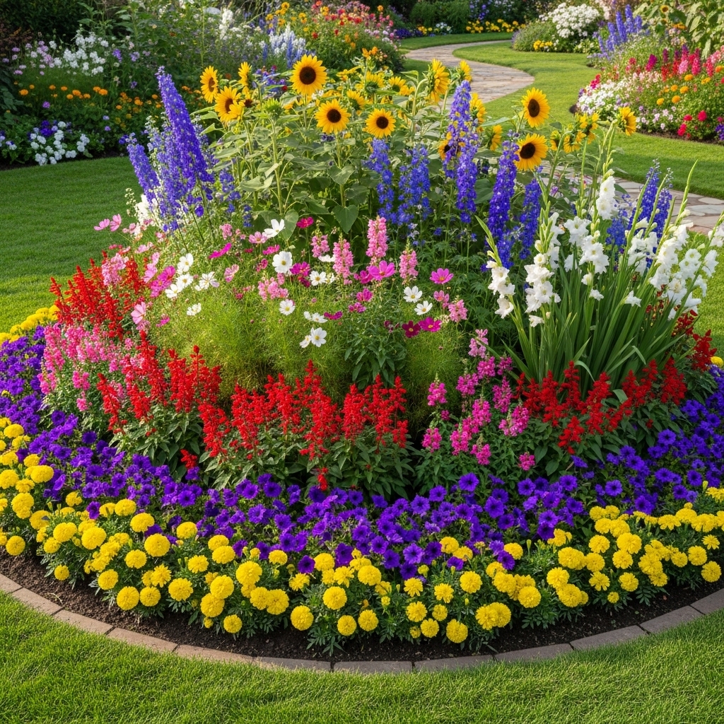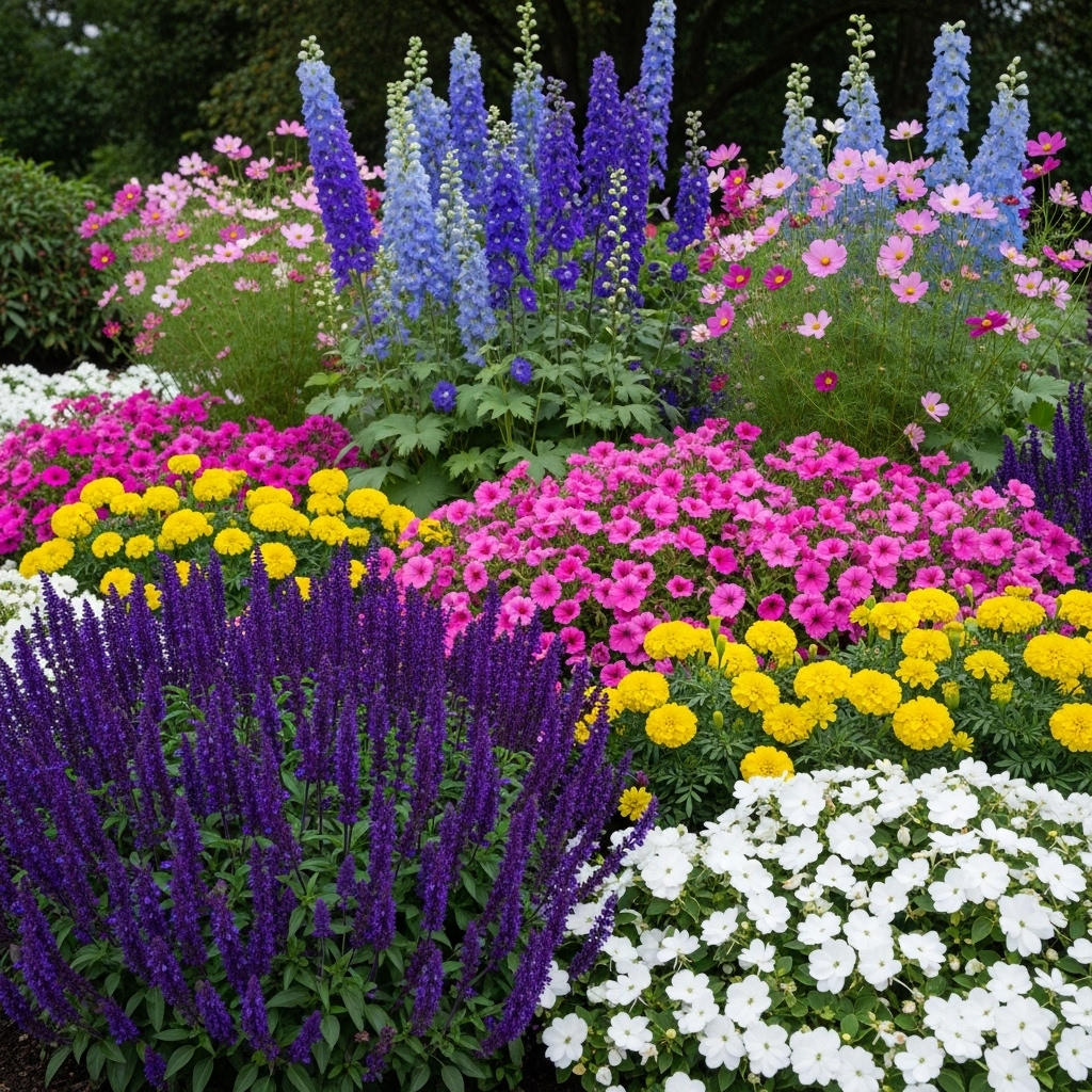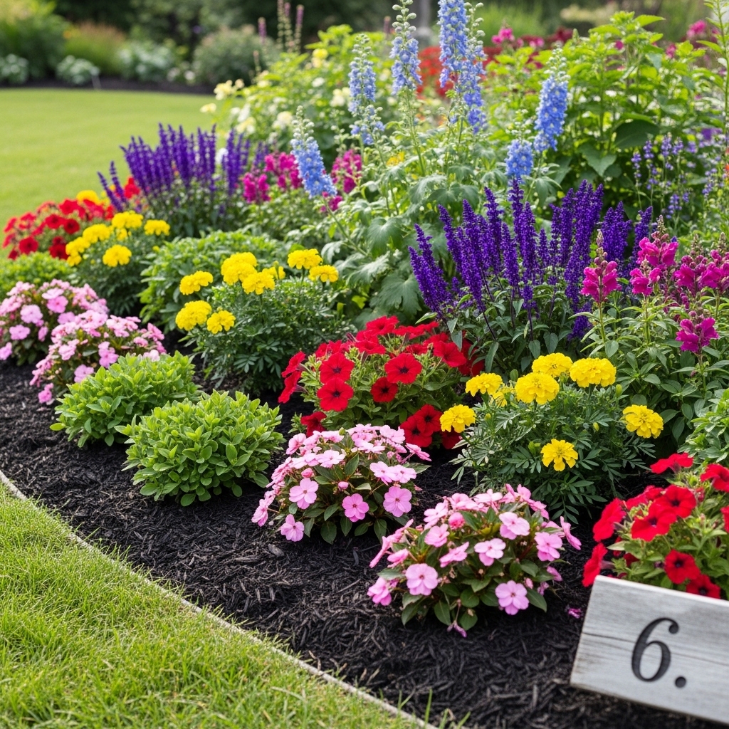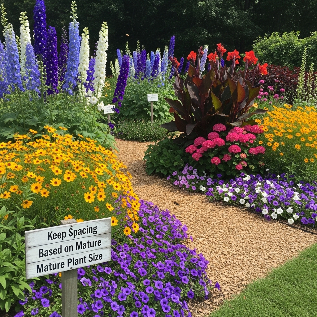 Place taller flowers at the back, medium in the middle, and shorter ones at the front. Maintain spacing for growth.