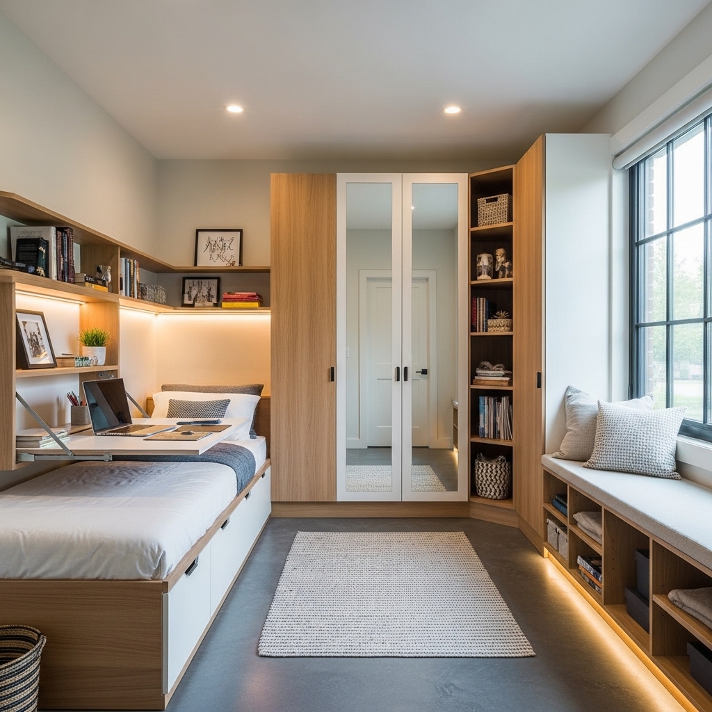 Built-in shelves, under-bed drawers, and wall-mounted cabinets help maximize storage without overcrowding the room.