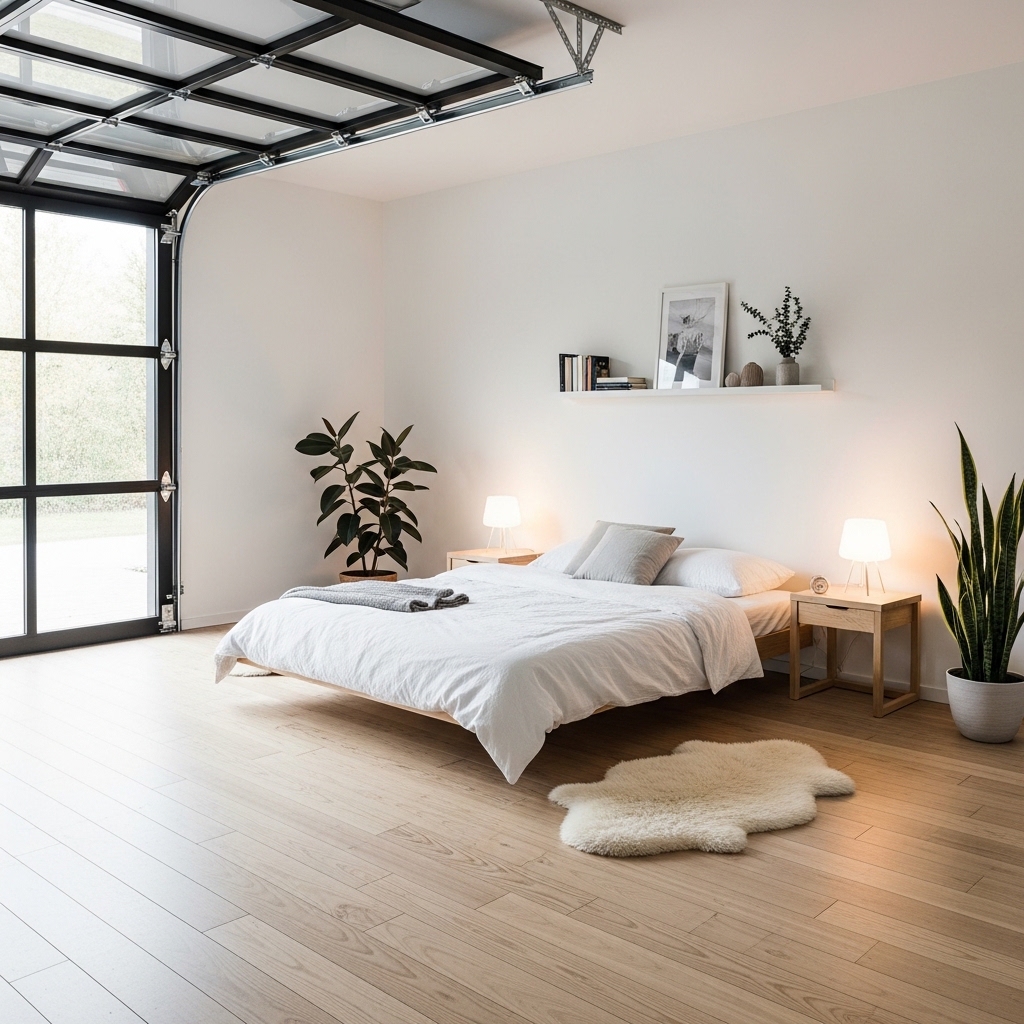 A minimalist garage conversion bedroom focuses on simplicity, clean lines, and clutter-free design. Light-colored walls, simple furniture, and minimal decor make the room feel larger and more open.
