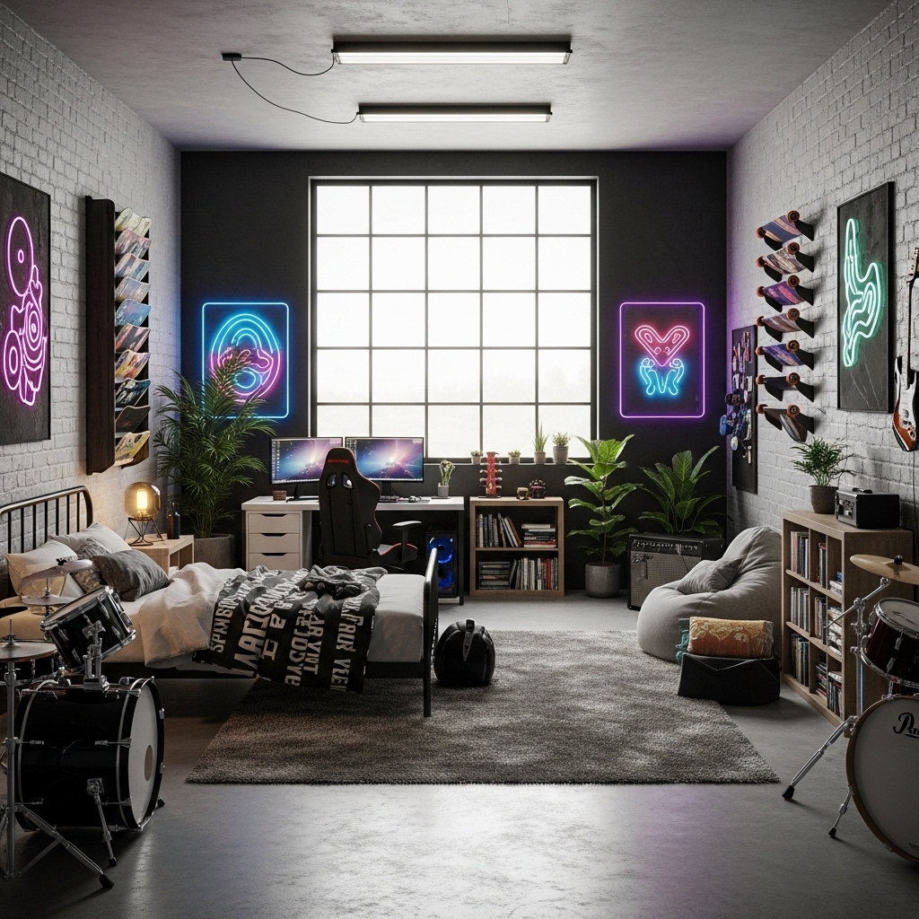 Creative wall decor, LED lighting, and personalized design elements help reflect the teen’s personality.