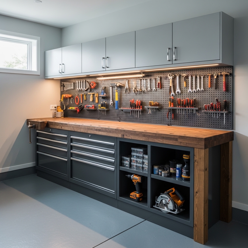 Build or install a workbench with built-in drawers, shelves, or cabinets underneath. Keep essential tools within arm’s reach and use vertical storage above the bench for frequently used items.