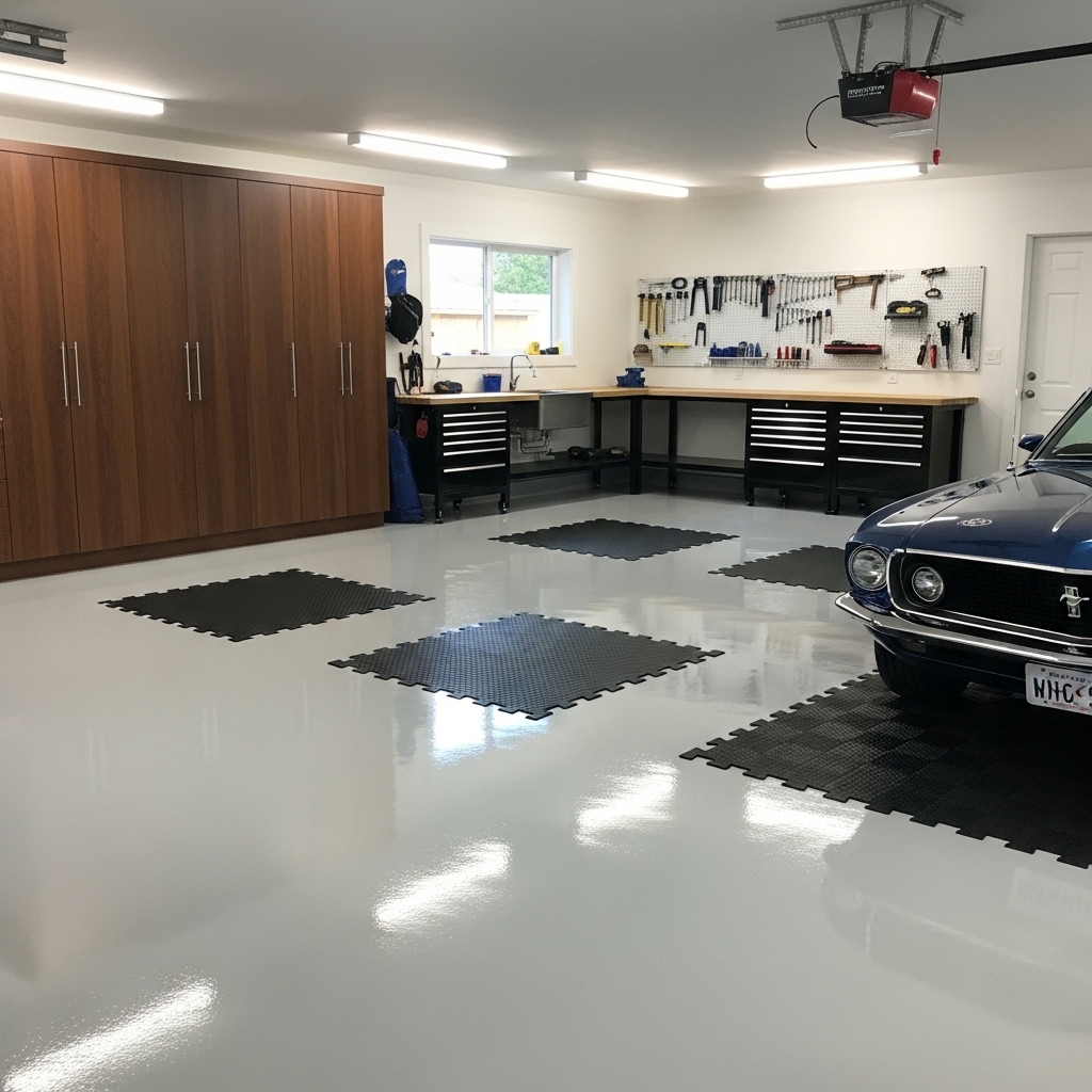 Apply epoxy coatings, rubber flooring, or interlocking tiles to create a durable and easy-to-clean surface. Choose materials that resist oil stains, moisture, and wear from heavy use.