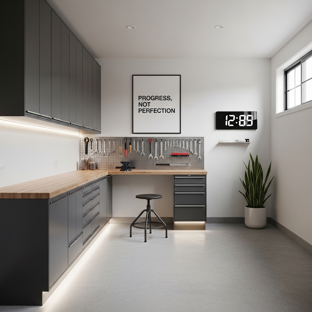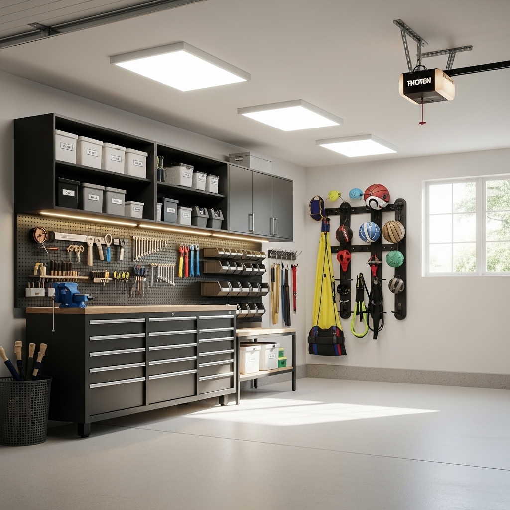 This works because proper lighting transforms how the garage feels and functions. Bright, evenly distributed light improves safety, productivity, and overall usability. A common mistake is relying on one central light source, which leaves corners dark and limits visibility.