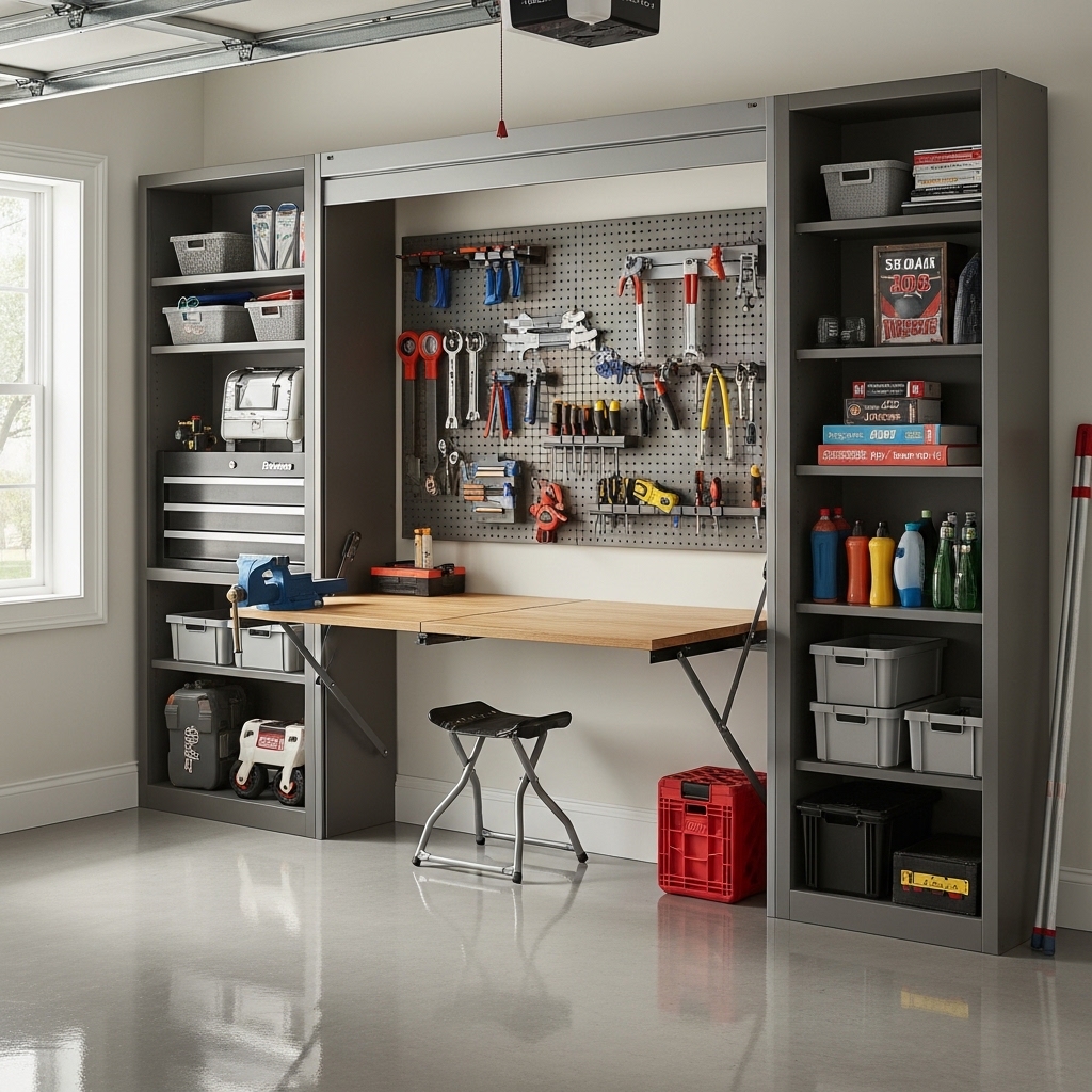Install fold-down tables that can be tucked away when not in use. Keep tools nearby for quick setup.