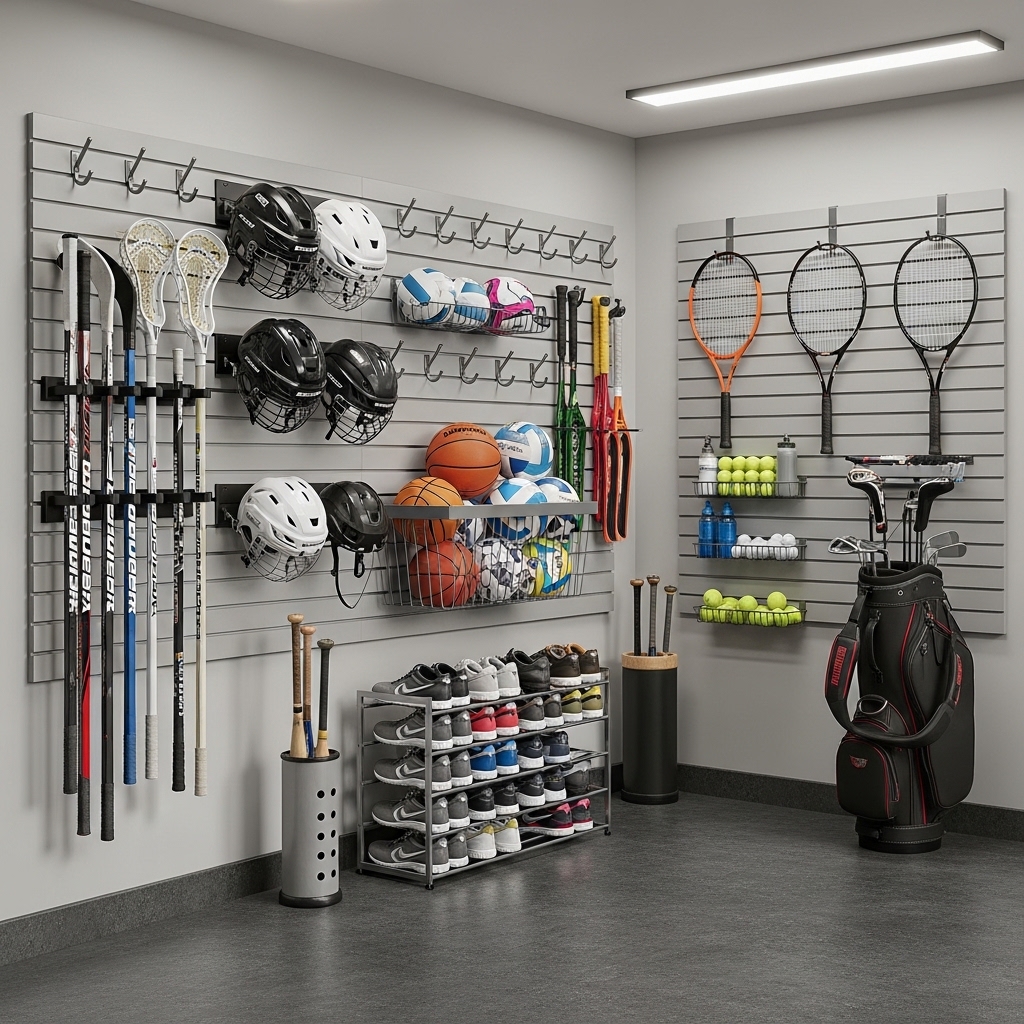 Create a dedicated section for sports equipment using racks, bins, and hooks. Separate items by activity for easy access.