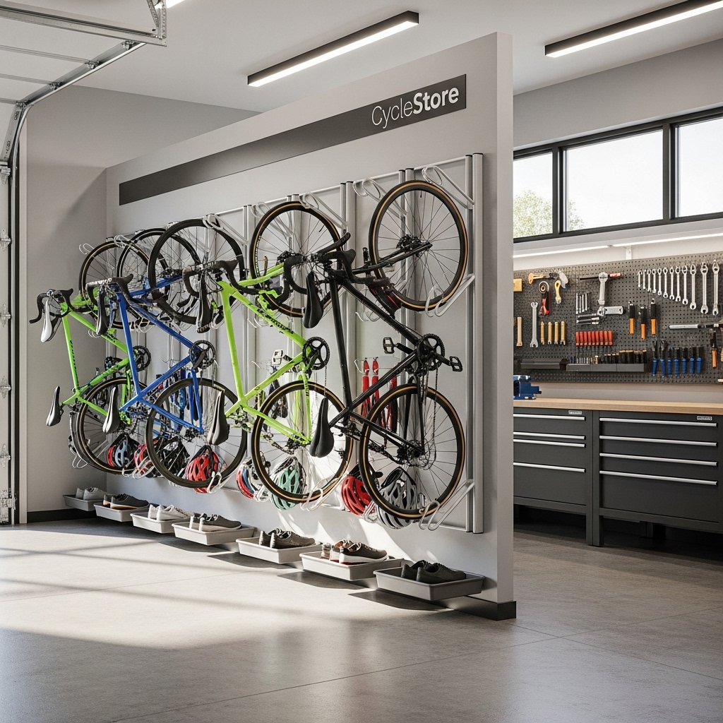 Install wall-mounted or ceiling-mounted bike racks to store bicycles vertically or horizontally depending on your garage layout. Position racks along walls that are less frequently accessed to avoid blocking main pathways. Use staggered heights if storing multiple bikes to prevent handlebar interference.