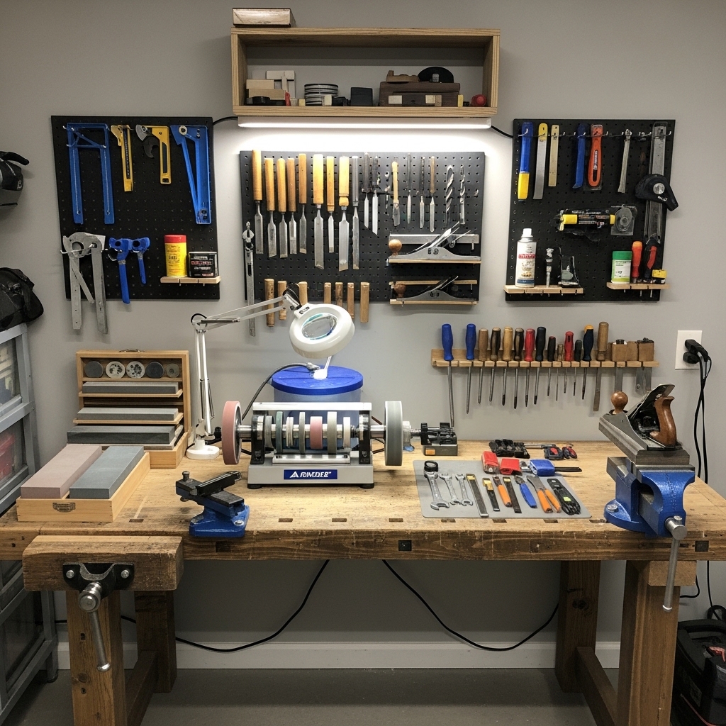 Dedicate a small corner of your workshop to sharpening. Mount a vise. Store stones and guides nearby.