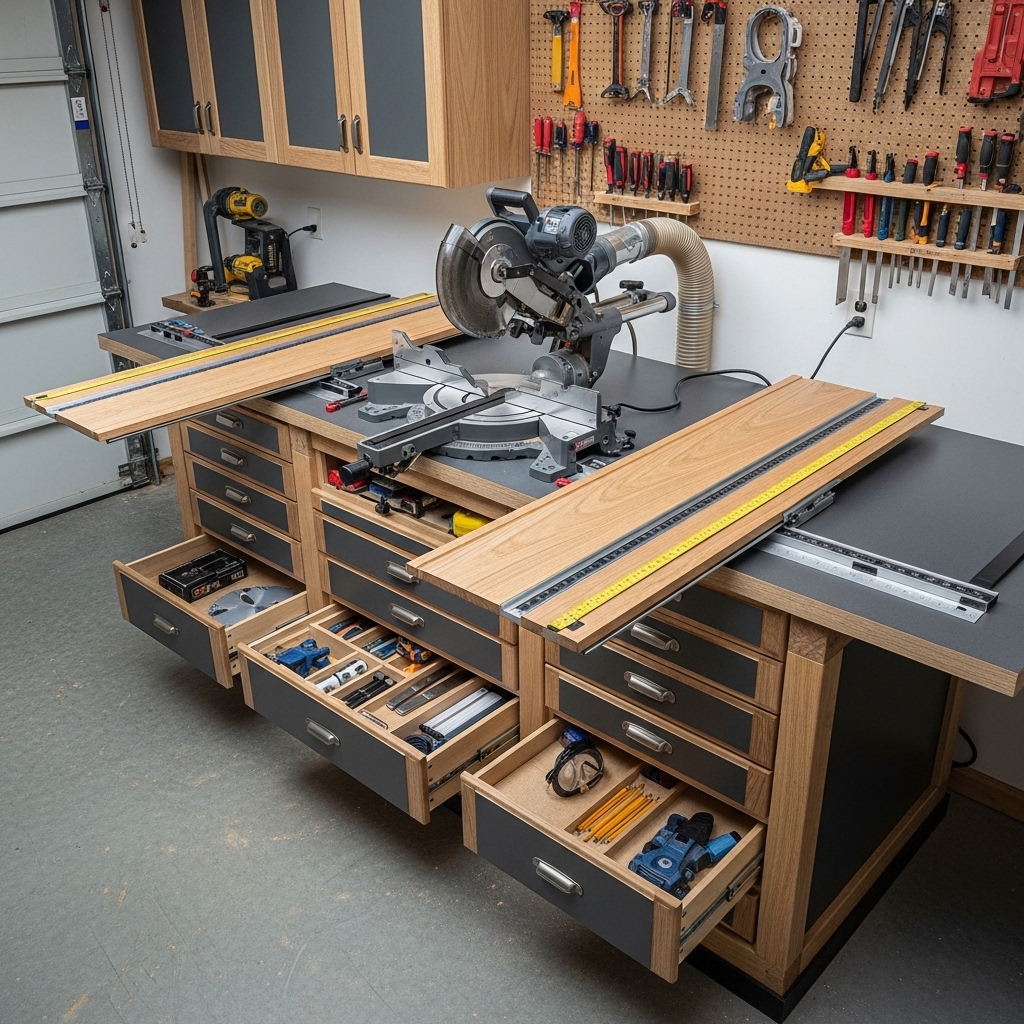A proper station also stores saw blades, squares, and measuring tapes directly below the saw.