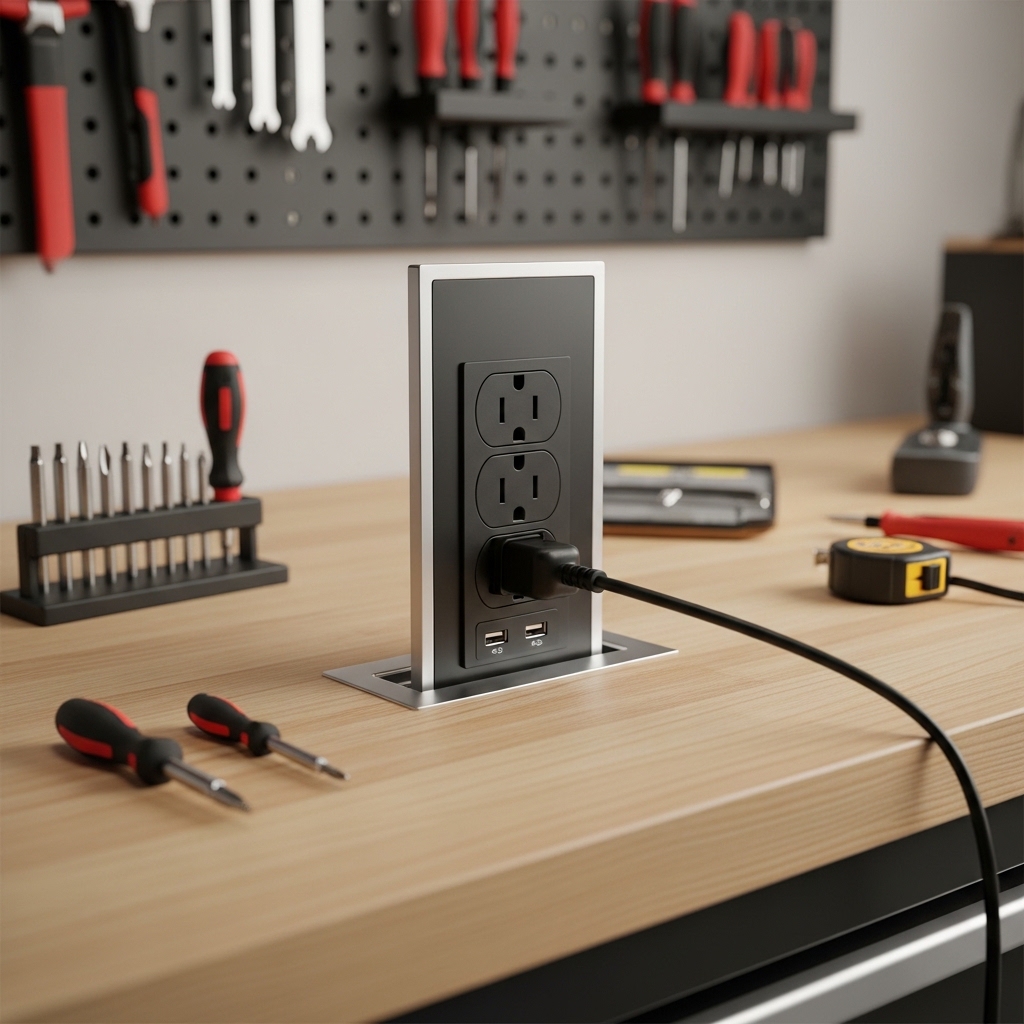 Install a pop-up power outlet directly into your workbench top. The outlet sits flush when not used.