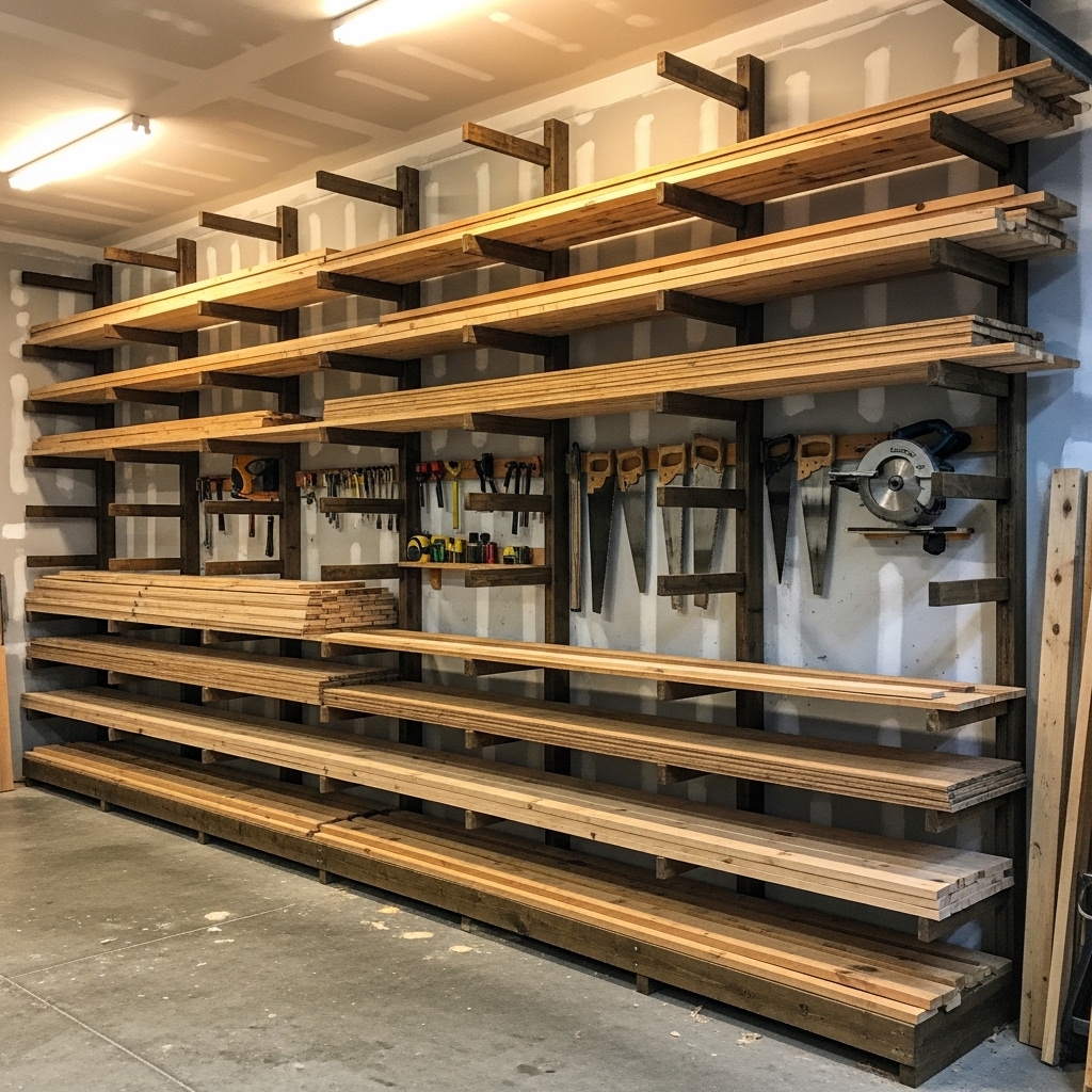 Build a lumber rack with arms extending from wall studs. Use 2×4 arms spaced 16 inches apart.