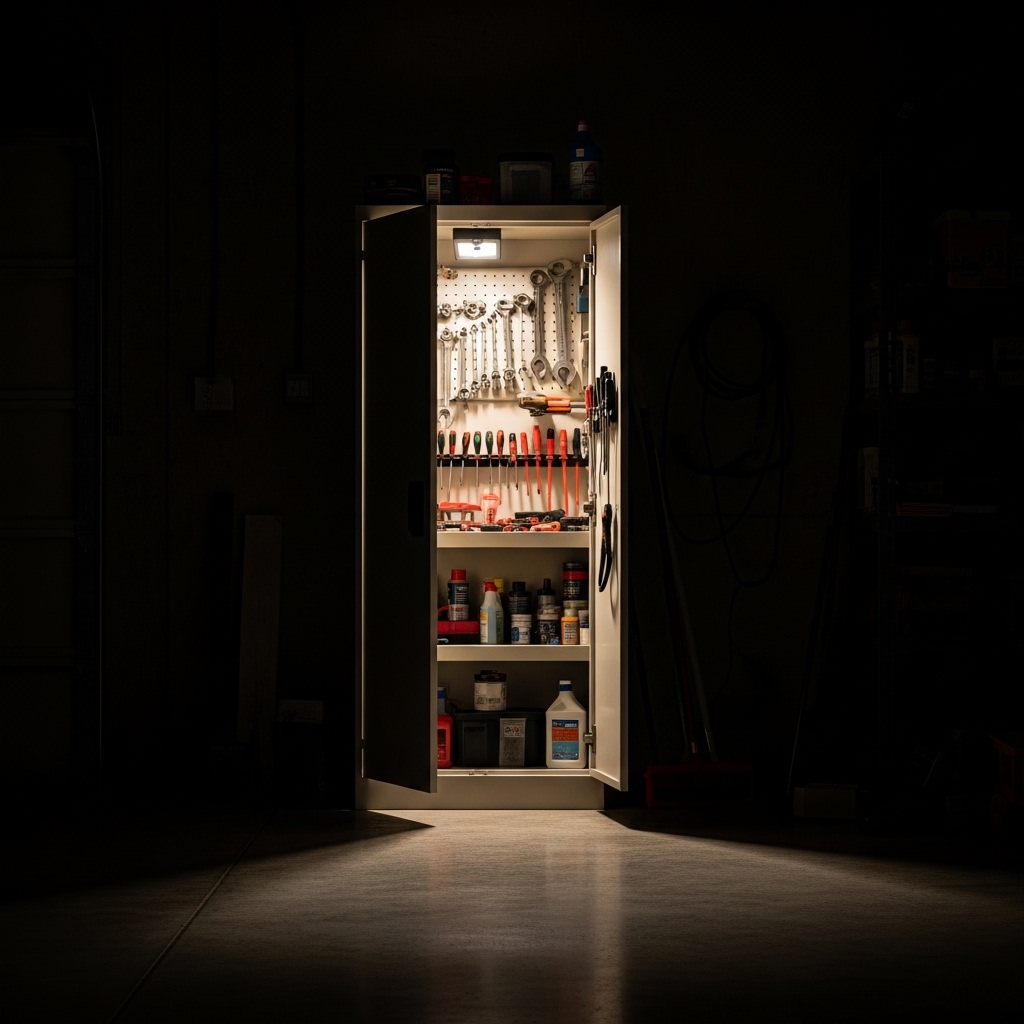 Open the cabinet door. The light turns on. See every tool. Close the door. The light turns off.