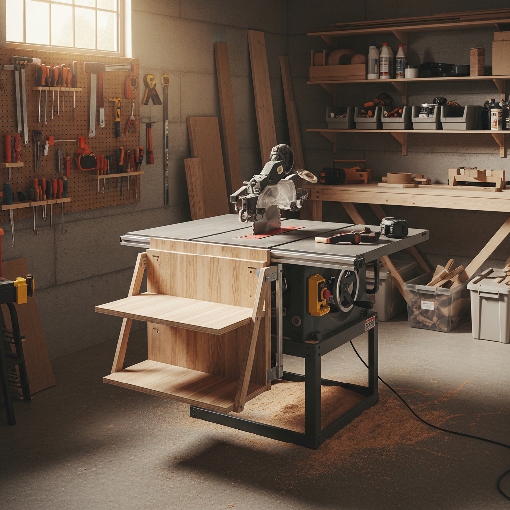 Pro Tip: Make the folding shelf the exact same height as your saw bed. Even 1/8 inch difference causes boards to catch.