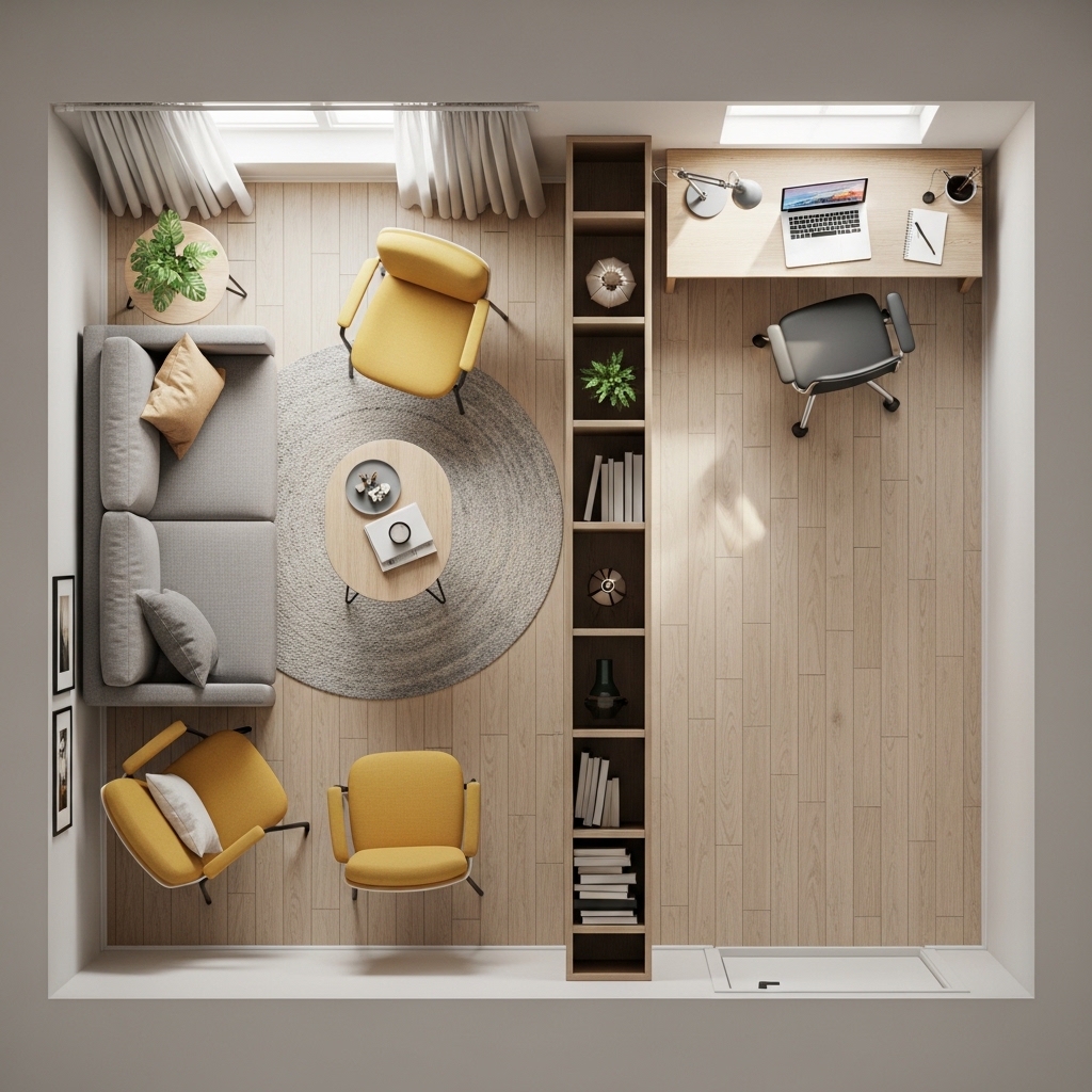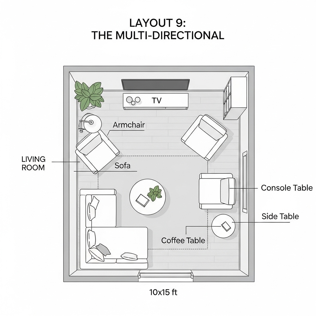 Pro Tip: Use lightweight chairs that can be moved easily. The multi-directional layout works best when furniture is flexible.