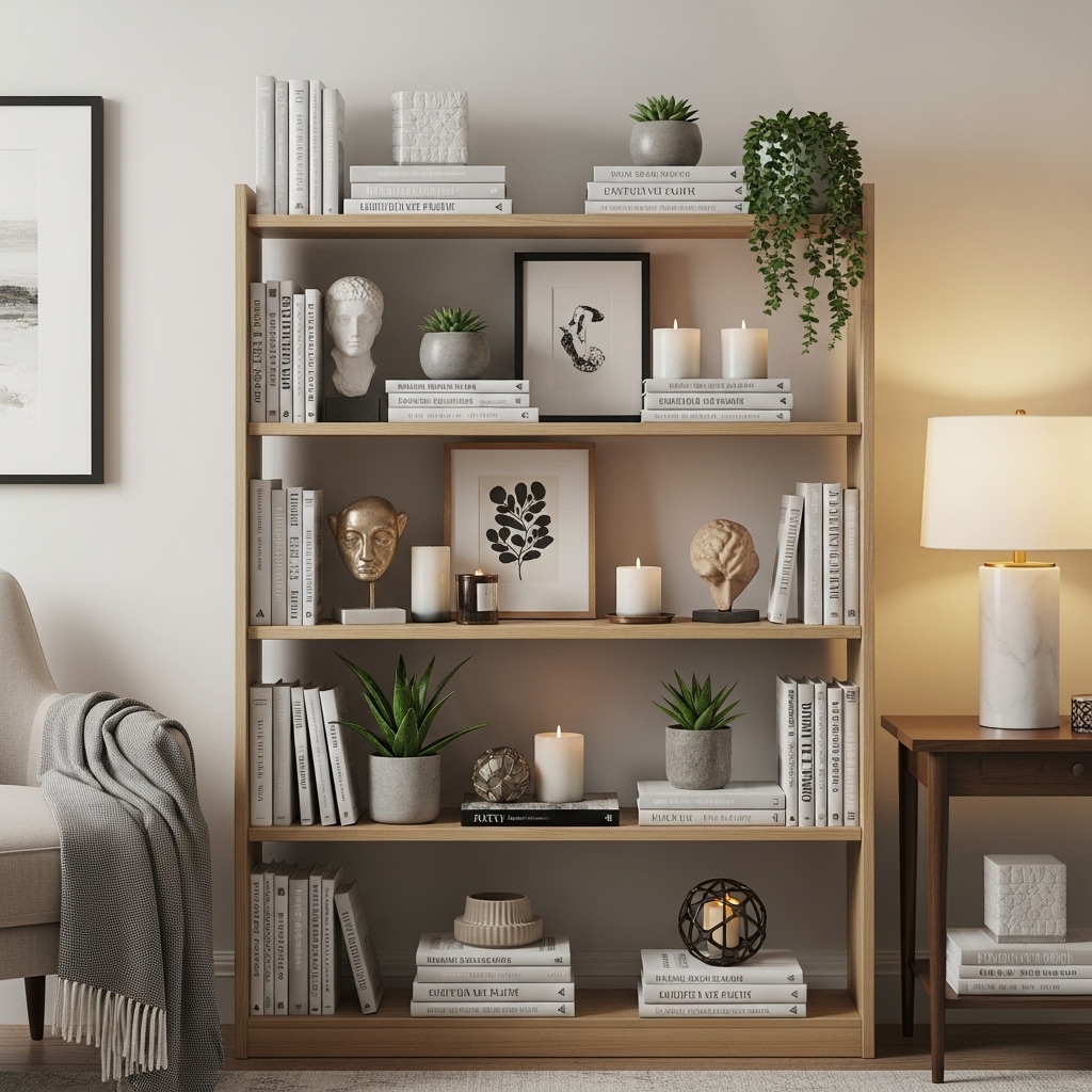 Pro Tip: Use the rule of thirds. Divide the shelf into three sections. Books in one section. Objects in another. Empty space in the third.