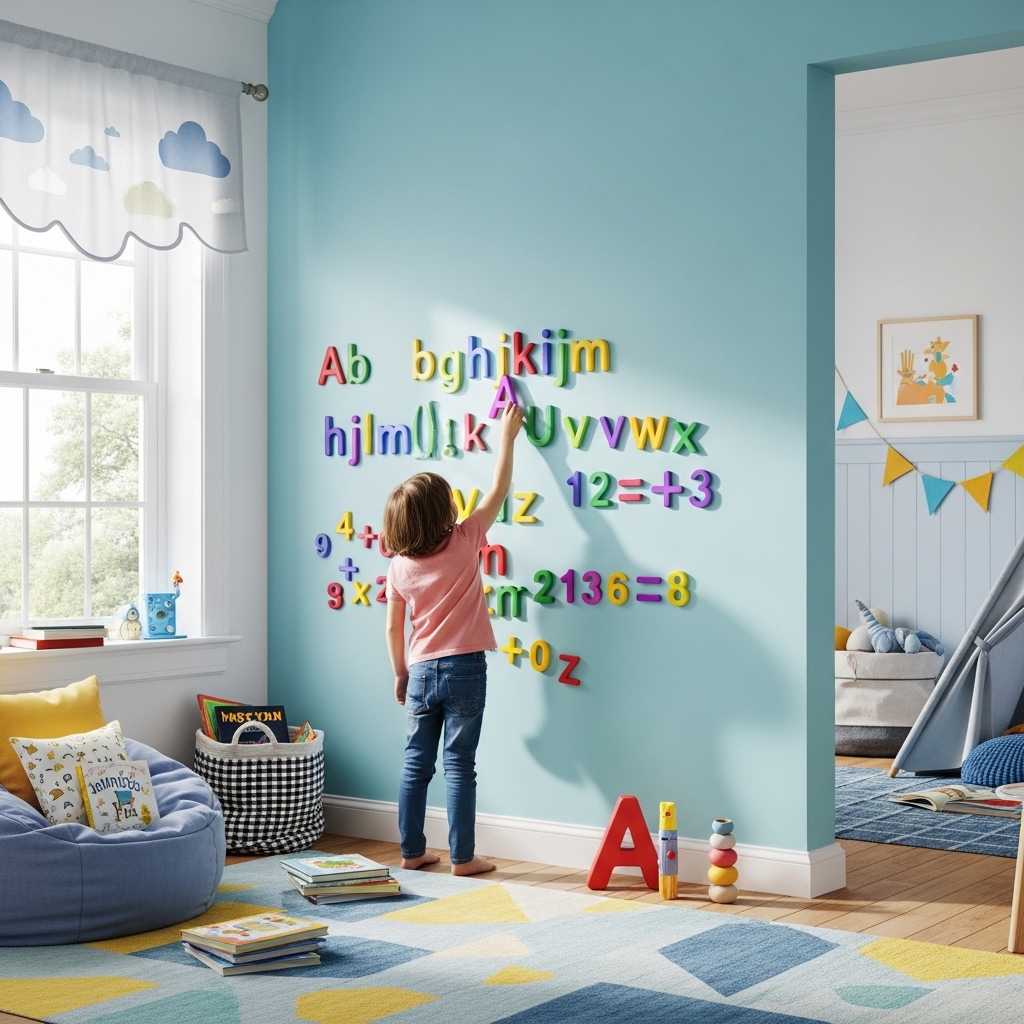 Install wall-mounted bookshelves at child height. Paint a world map wall for geography learning.