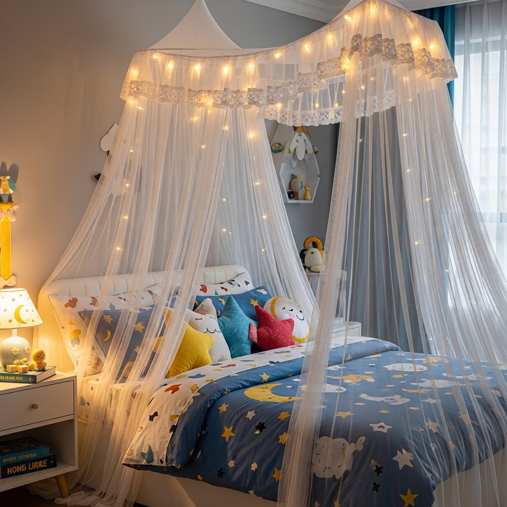 Install a ceiling hook above your child’s bed. Hang a sheer canopy or mosquito net from the hook.
