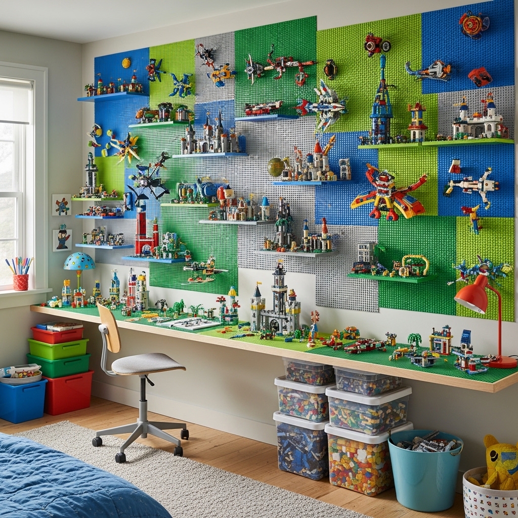 Your child builds Lego creations directly on the wall. Floor space stays clear for other activities.