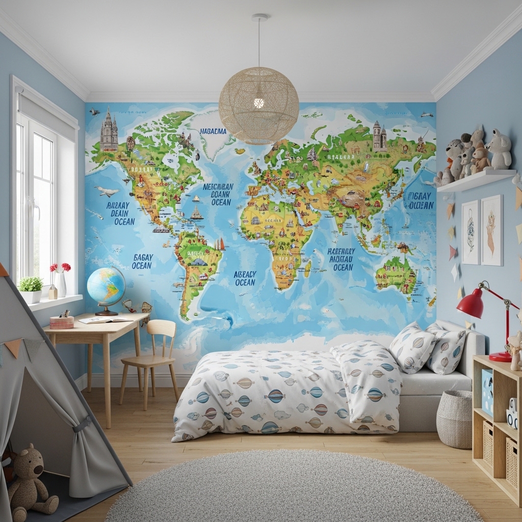 Paint or use a large removable wall decal of a world map on one full wall of your child’s bedroom.