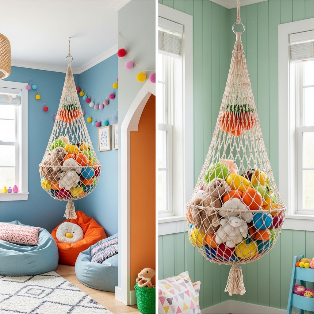 Apply this method when you need storage for small toys and have unused ceiling space.