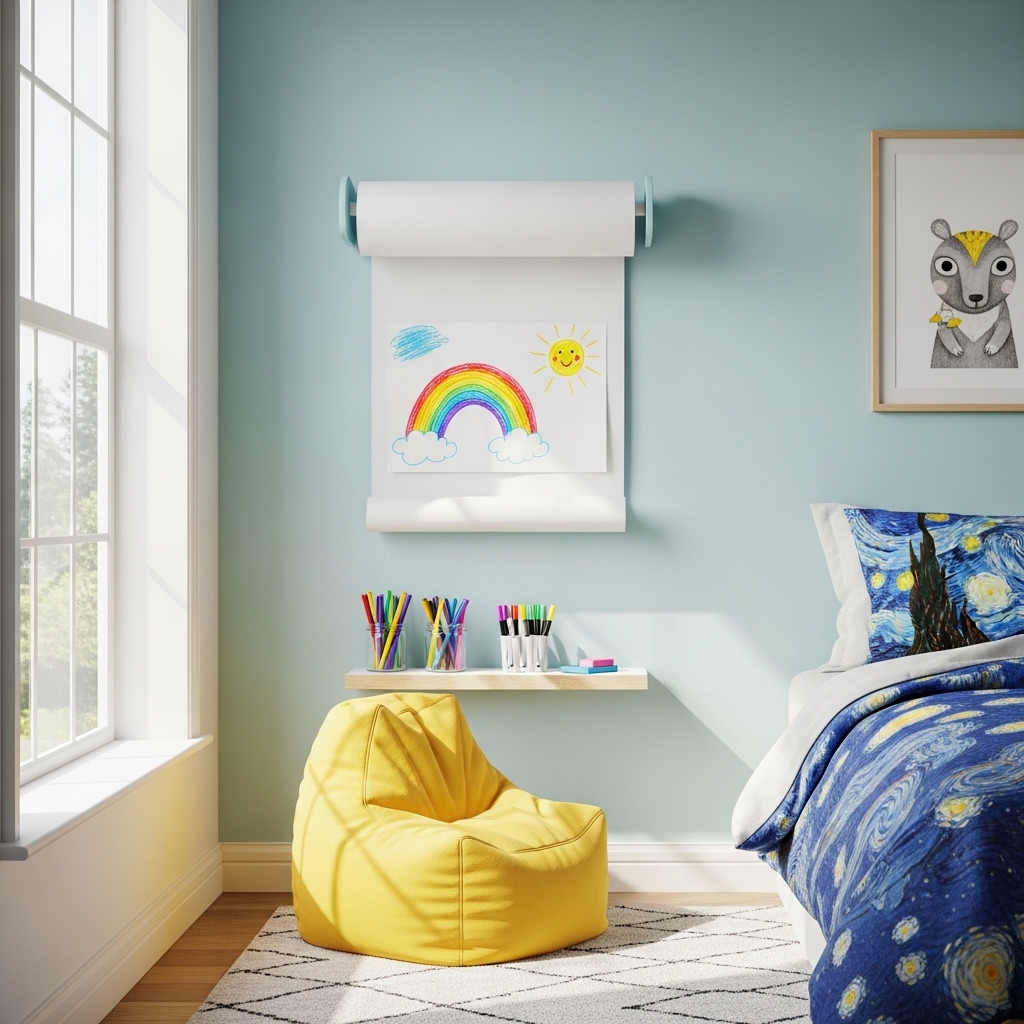 Use a rolling cart for art supplies. Install a wall-mounted whiteboard for daily drawing.