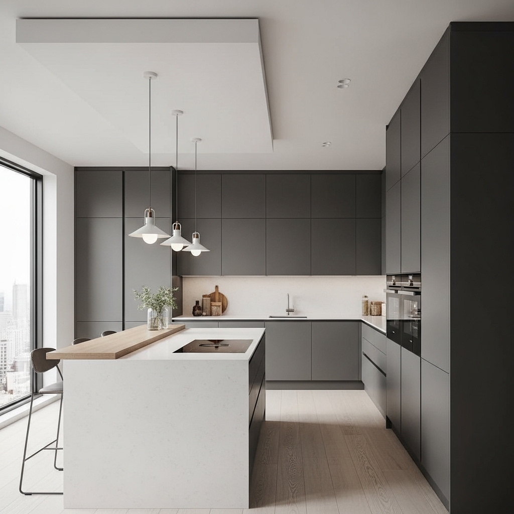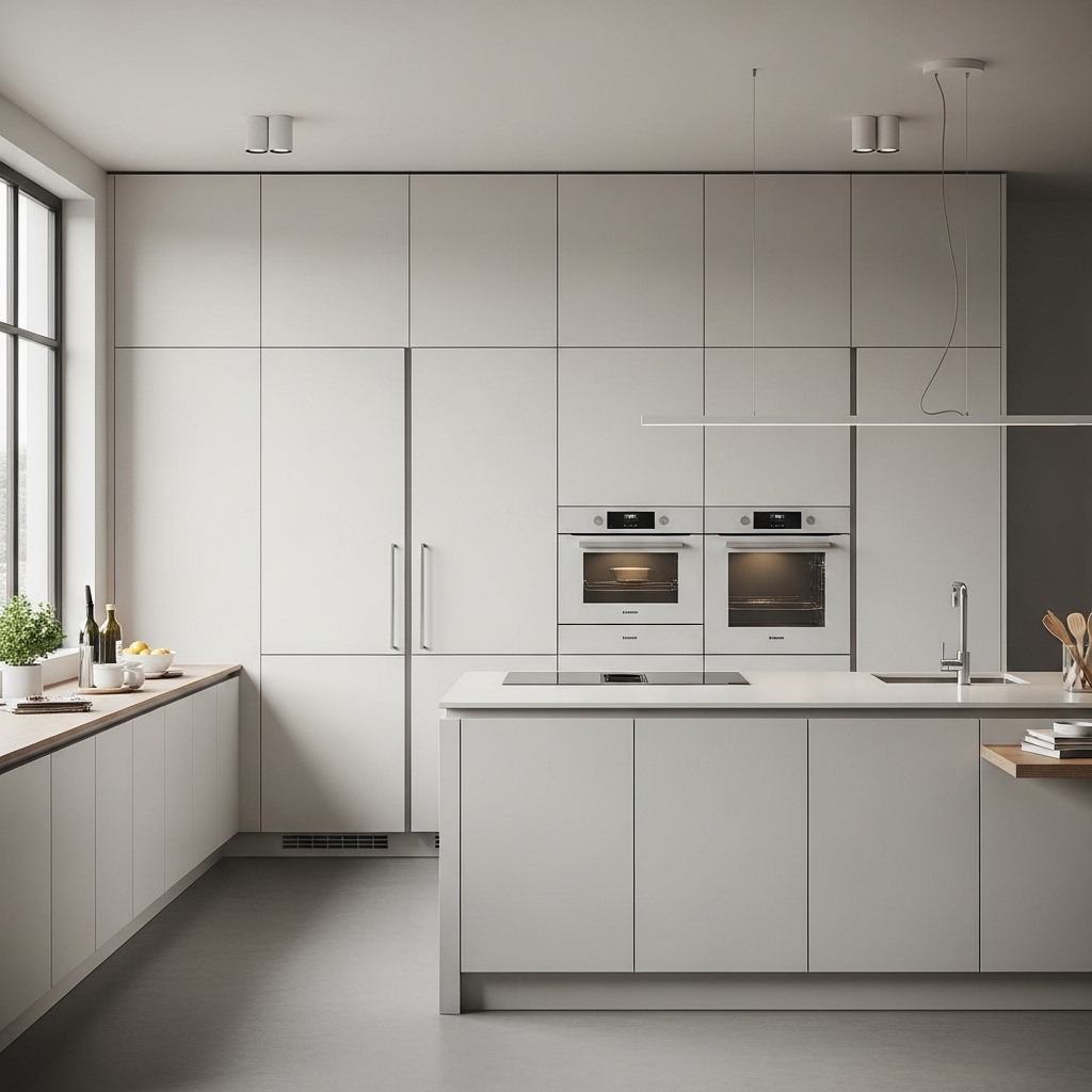 A flush ceiling finish eliminates visual breaks, creating a smooth, uninterrupted surface from countertop to ceiling. It enhances open-concept layouts and improves architectural flow.