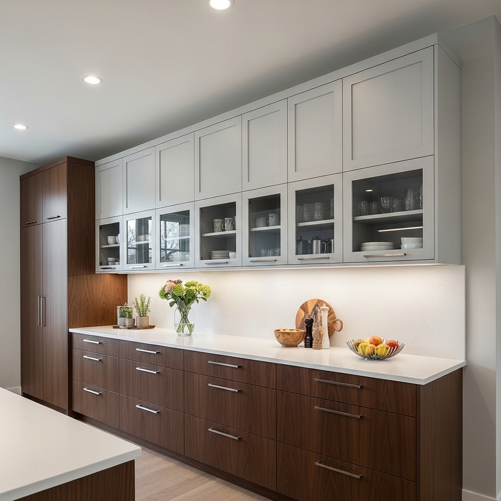 Glass-front cabinets at the top add elegance and reduce visual bulk. When extending cabinets to ceiling height, glass inserts prevent the design from feeling overwhelming.