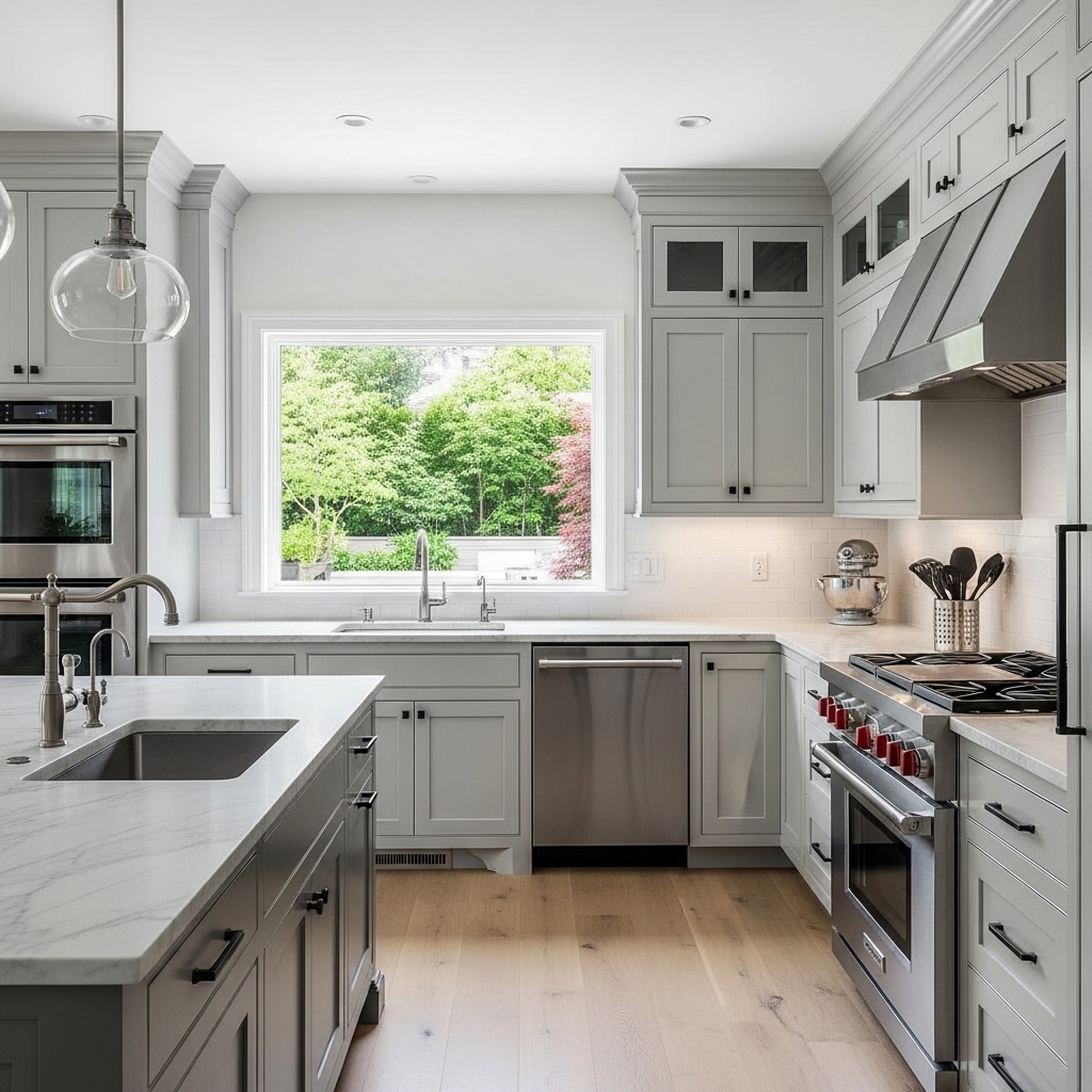 Adding decorative crown molding to ceiling-height cabinets elevates the entire kitchen. It bridges any minor ceiling unevenness and creates a high-end custom appearance.