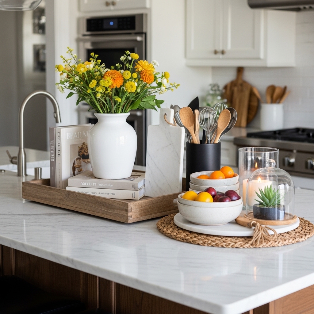 Layering is the secret behind high-end kitchen island decor. Start with a tray, then add varying heights such as a candle, small plant, and a functional kitchen item.
