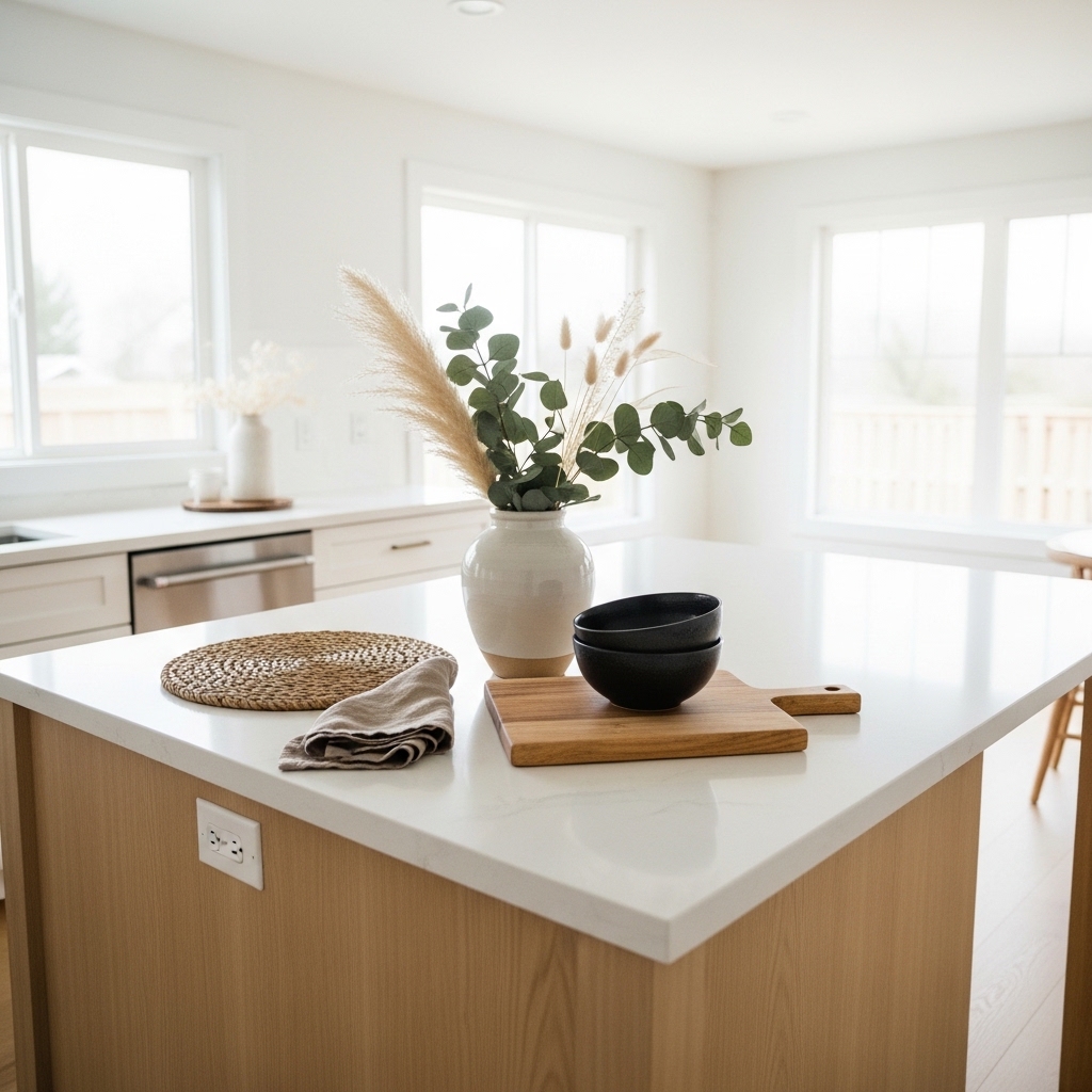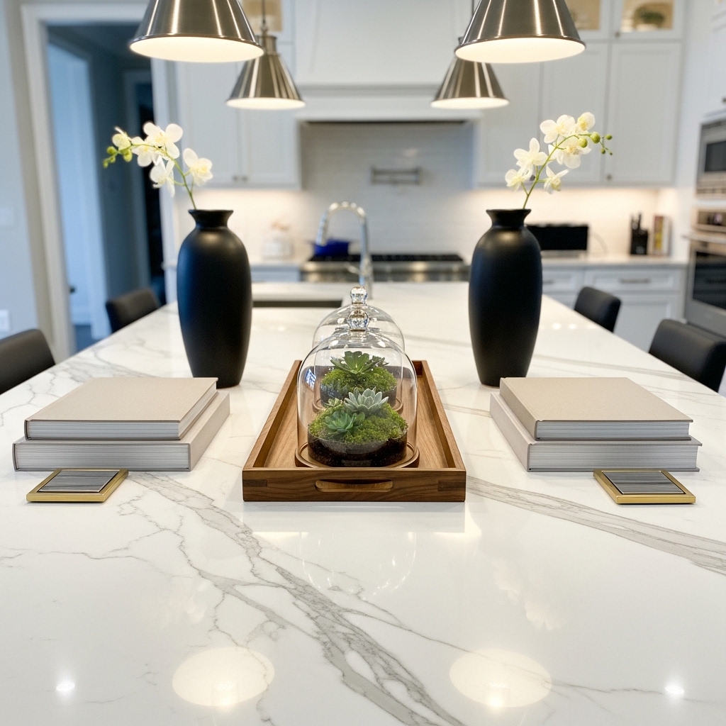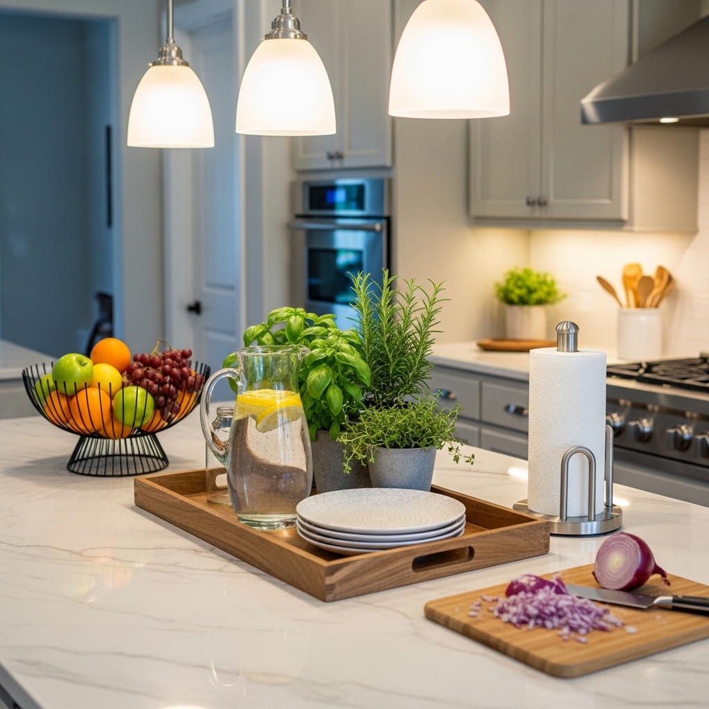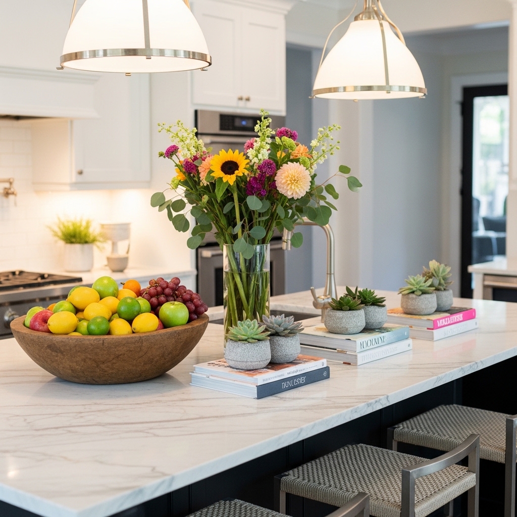Height adds dimension, especially in open-concept kitchens where the island connects multiple spaces. Keeping the rest of the surface minimal ensures the centerpiece feels intentional rather than overwhelming.