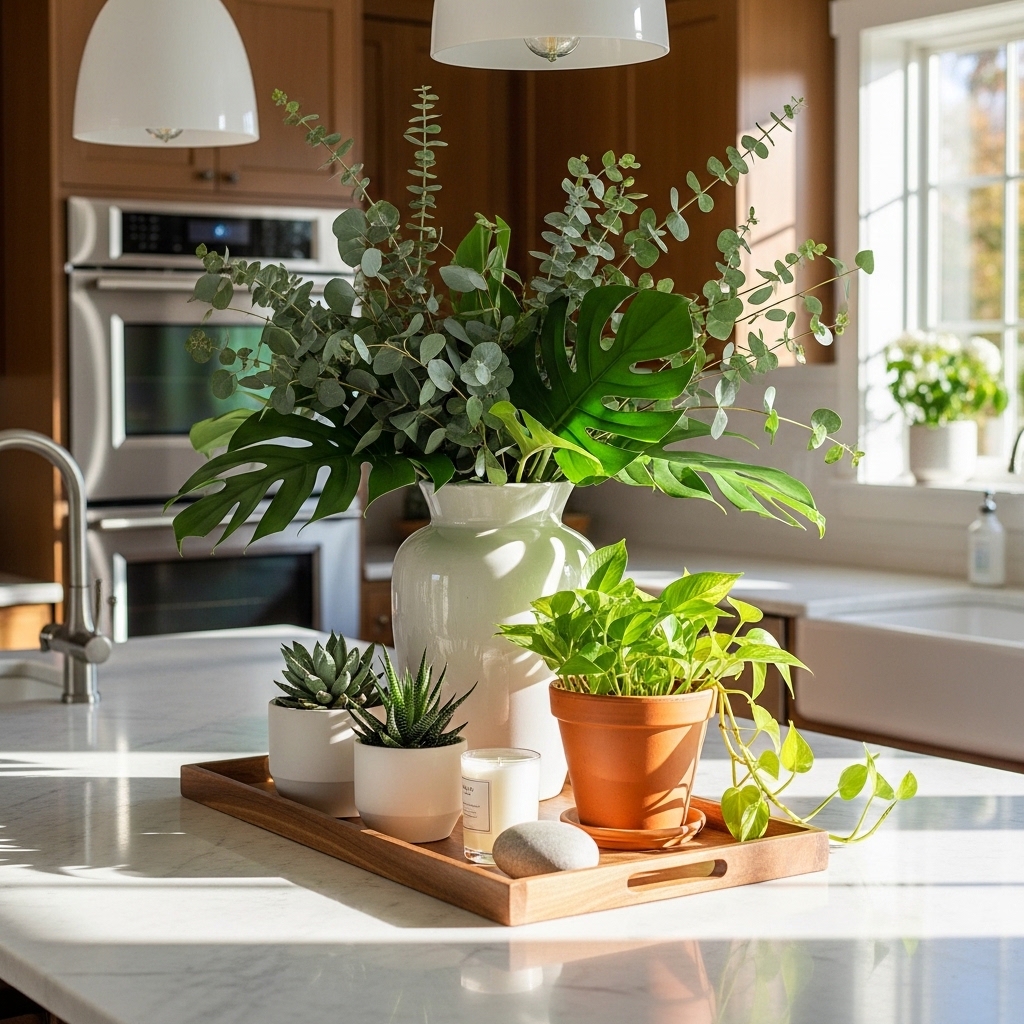 Greenery introduces life and contrast to hard countertop surfaces. A low arrangement of eucalyptus, a potted herb garden, or a simple leafy plant adds freshness without clutter.