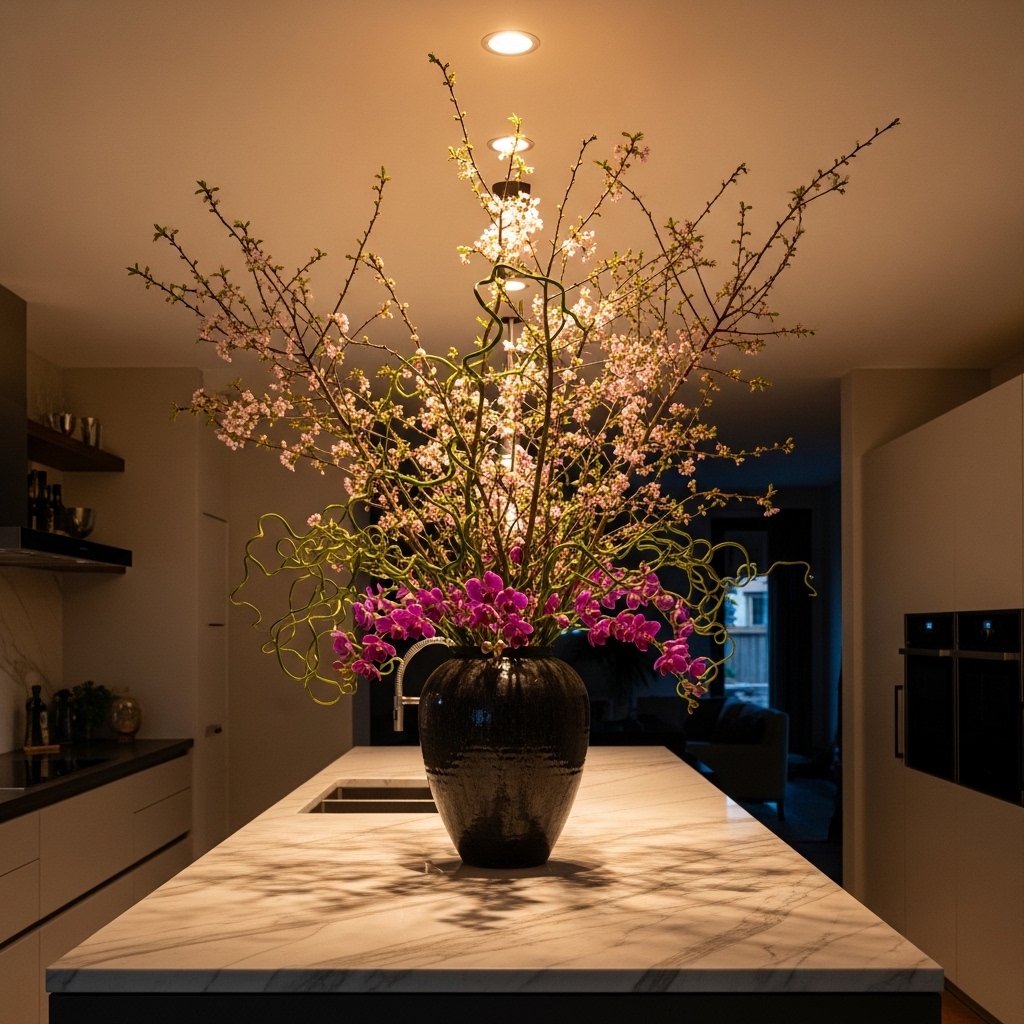Every well-styled kitchen island needs a visual anchor. A tall vase with branches, a sculptural ceramic piece, or a dramatic floral arrangement instantly draws the eye upward.