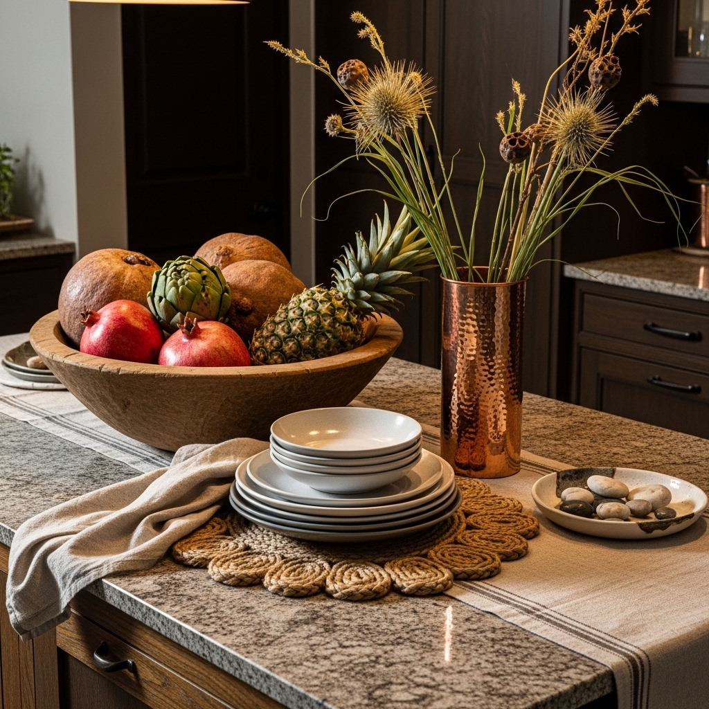 Texture plays a major role in impactful kitchen island styling. Woven trays, wooden boards, stone bowls, or linen runners introduce warmth and dimension.