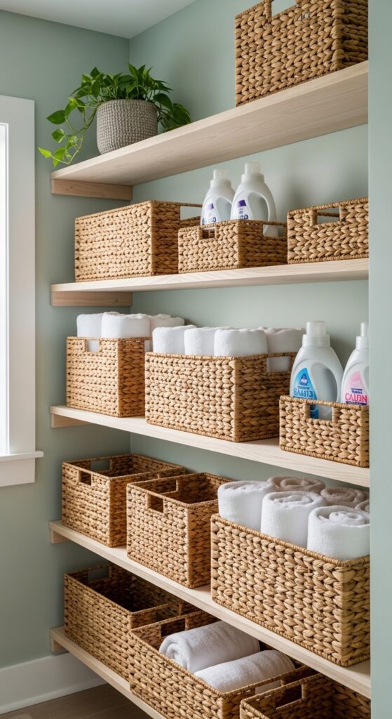 11. Use Woven Baskets on Open Shelves