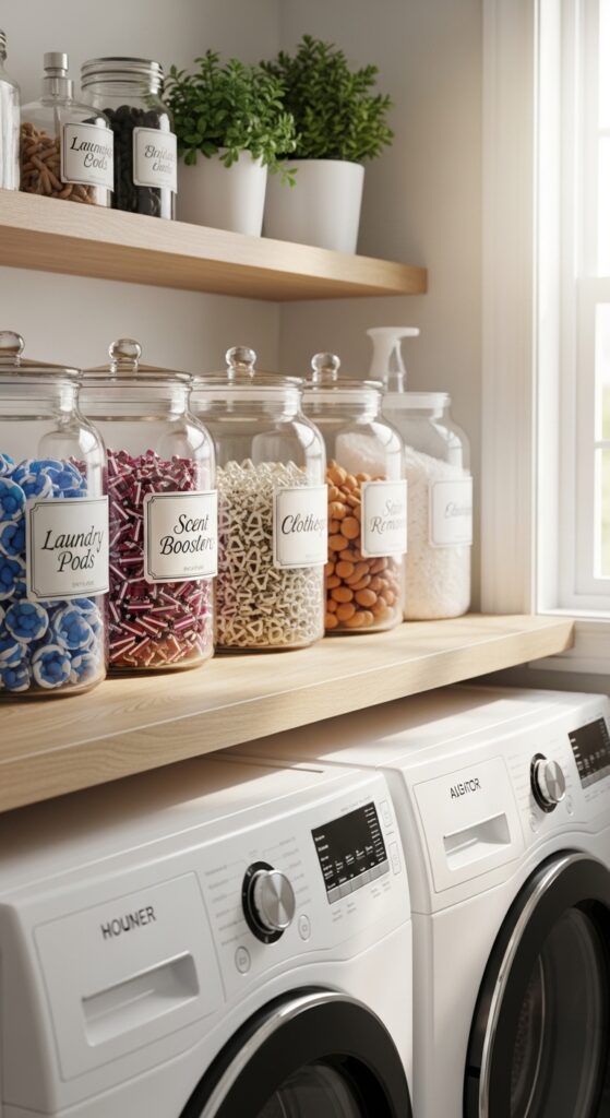 Display glass jars filled with laundry supplies on open shelves. Functional storage becomes decor.