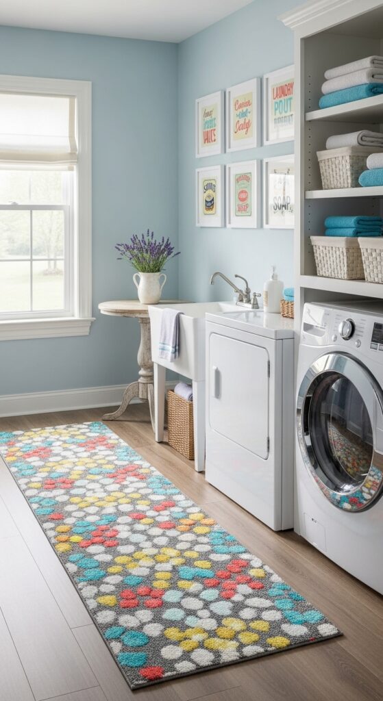 Neutral rugs are safe. Colored rugs are joyful. Your laundry room can handle some joy.